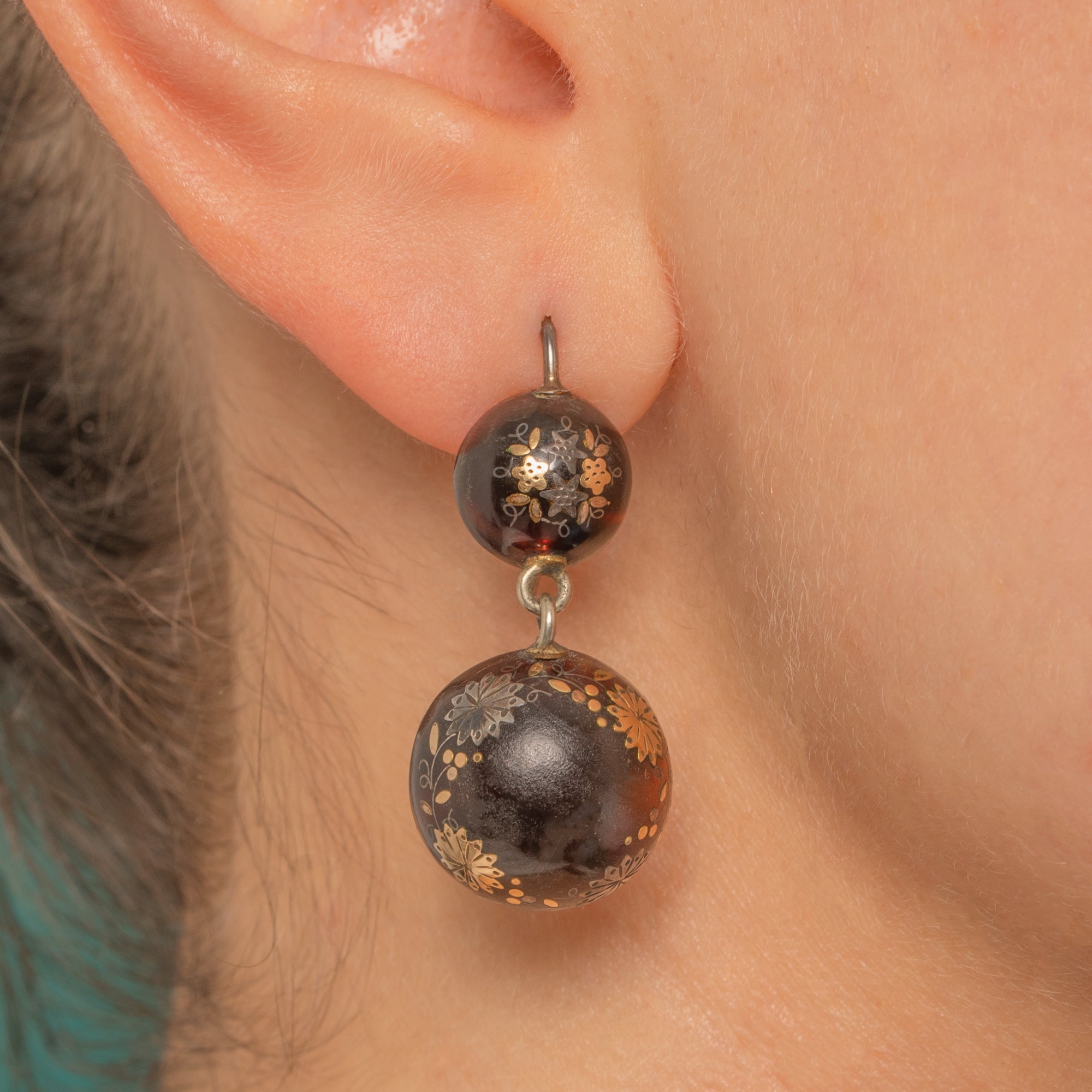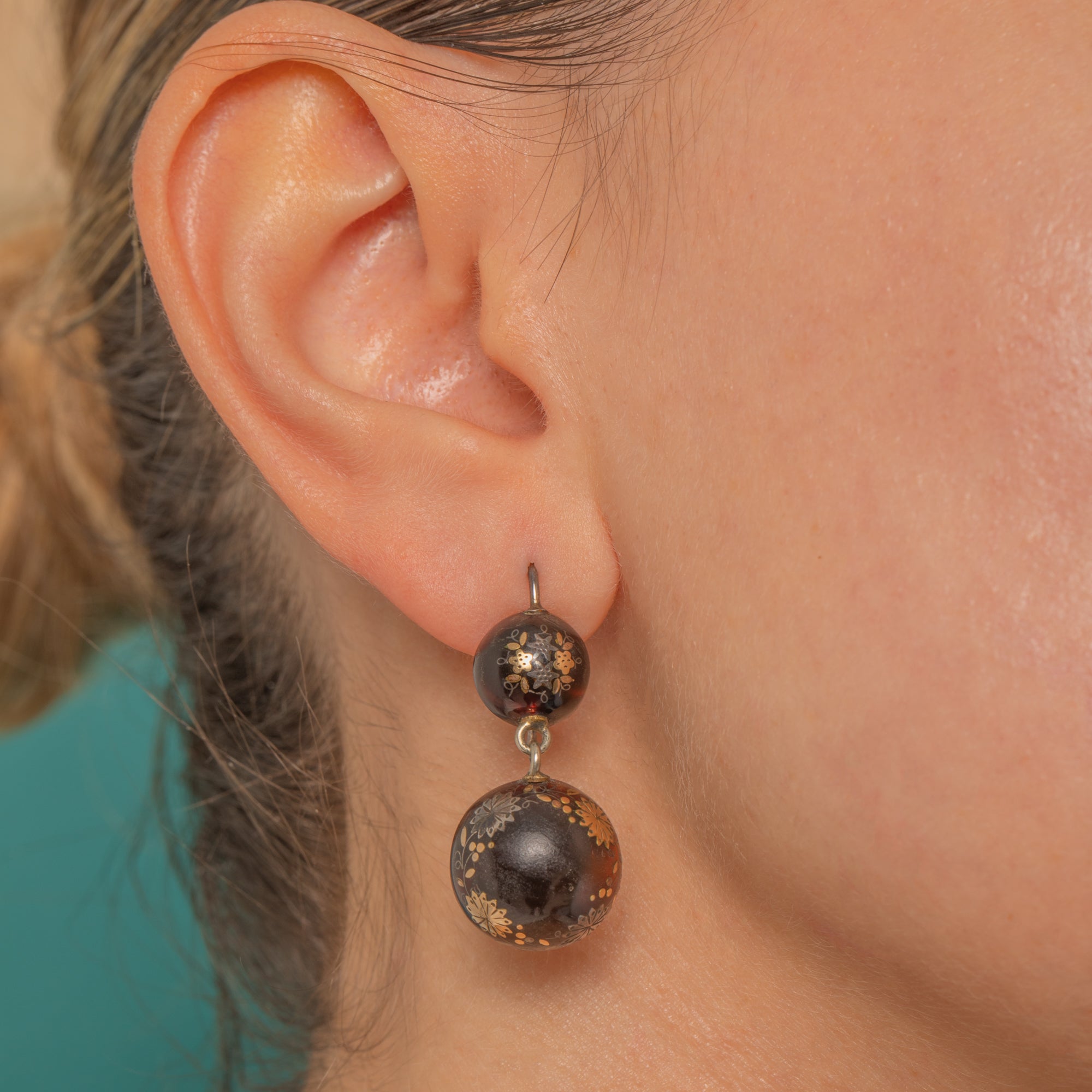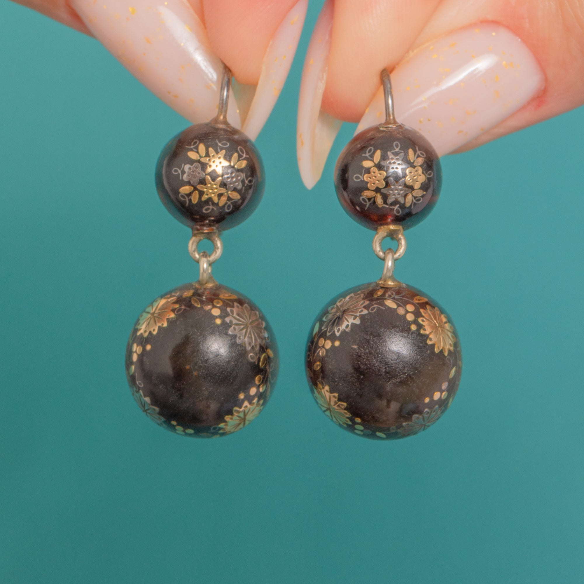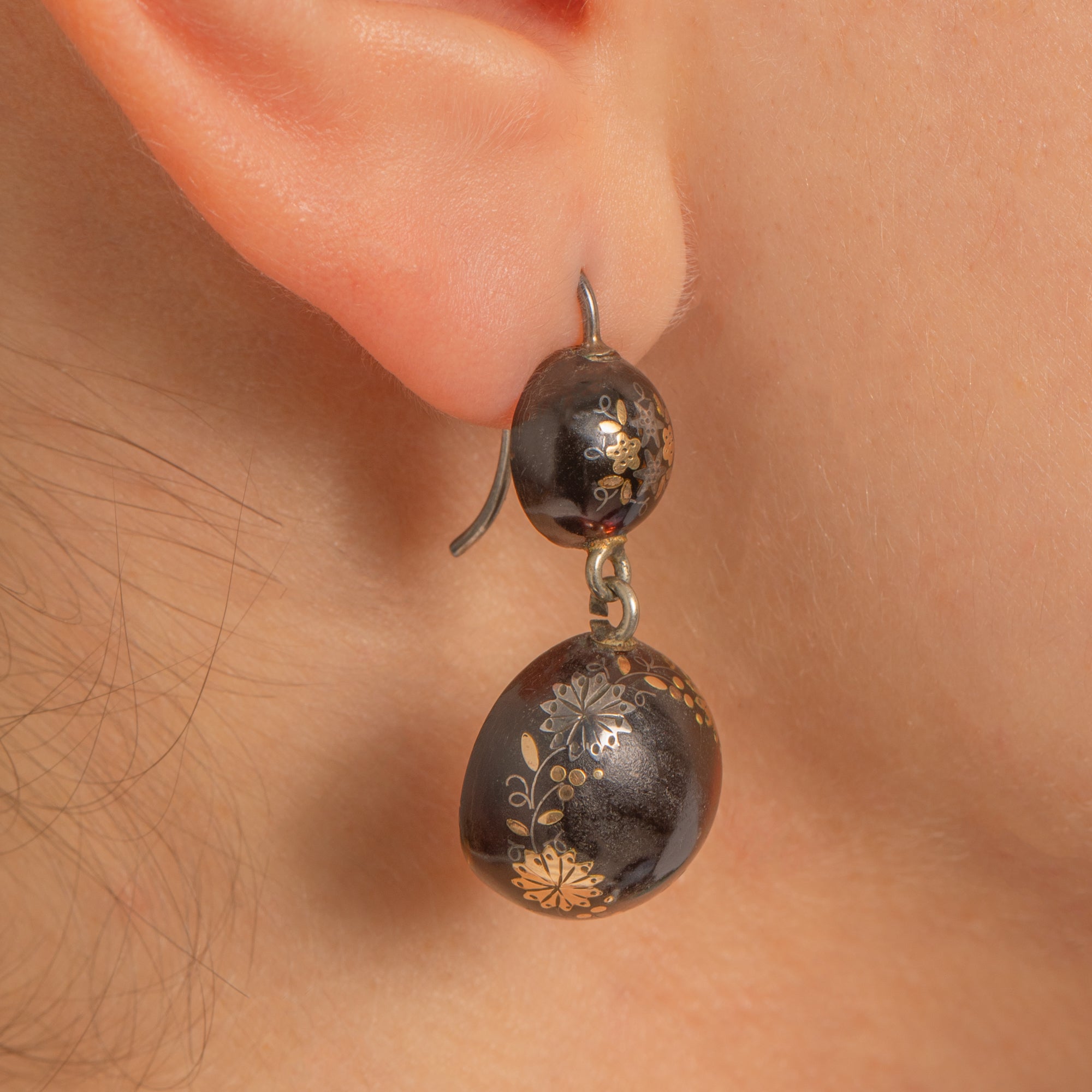 These Victorian Piqué double-drop earrings are a beautifully balanced study in contrast and craft. Each glossy dark “lentil” is enriched with fine 9ct Gold foliate sprays, rosettes and dotted scrollwork, the larger drop encircled by a delicate garland motif for an elegant Aesthetic/Japonisme flourish. The graduated, articulated construction gives a subtle sway that catches the light on every detail.