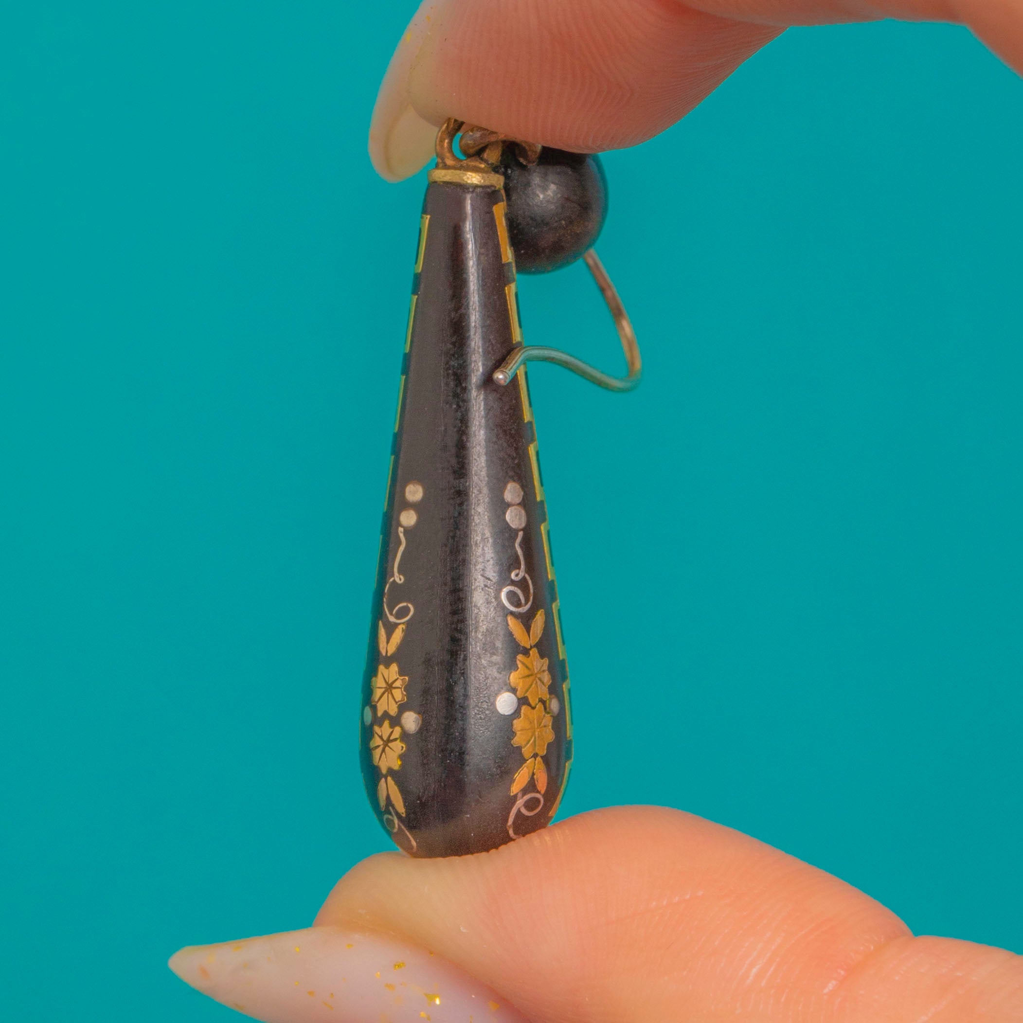 Graphic and elegant, these Victorian Piqué drop earrings marry inky black with glints of Gold and Silver inlay. A petite round bead with a five-point star suspends a tapered torpedo teardrop, all articulated for graceful movement. The surface is finely worked with geometric borders, chain-like bands and delicate foliate sprays, creating a striking black-and-gold contrast emblematic of the era’s refined taste.