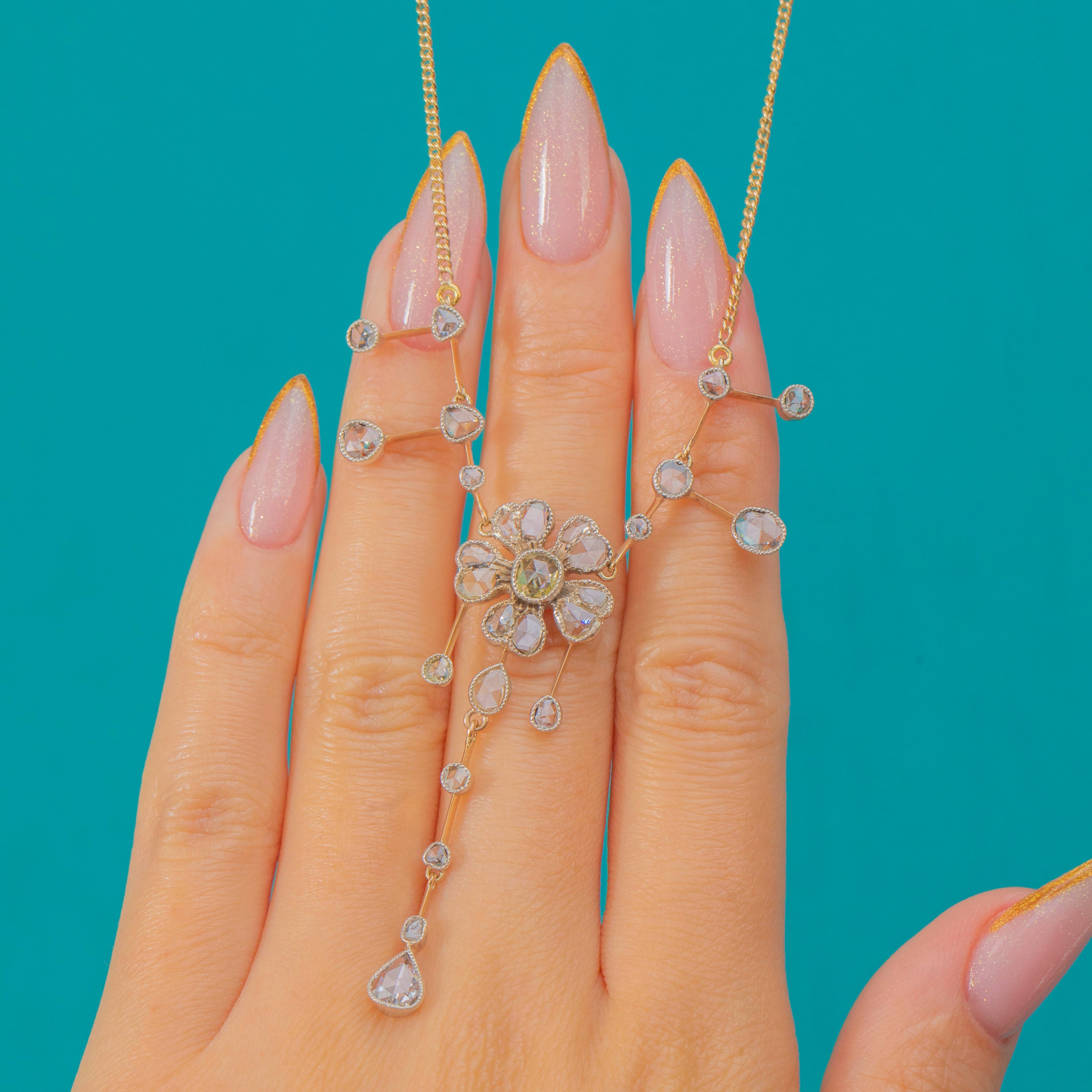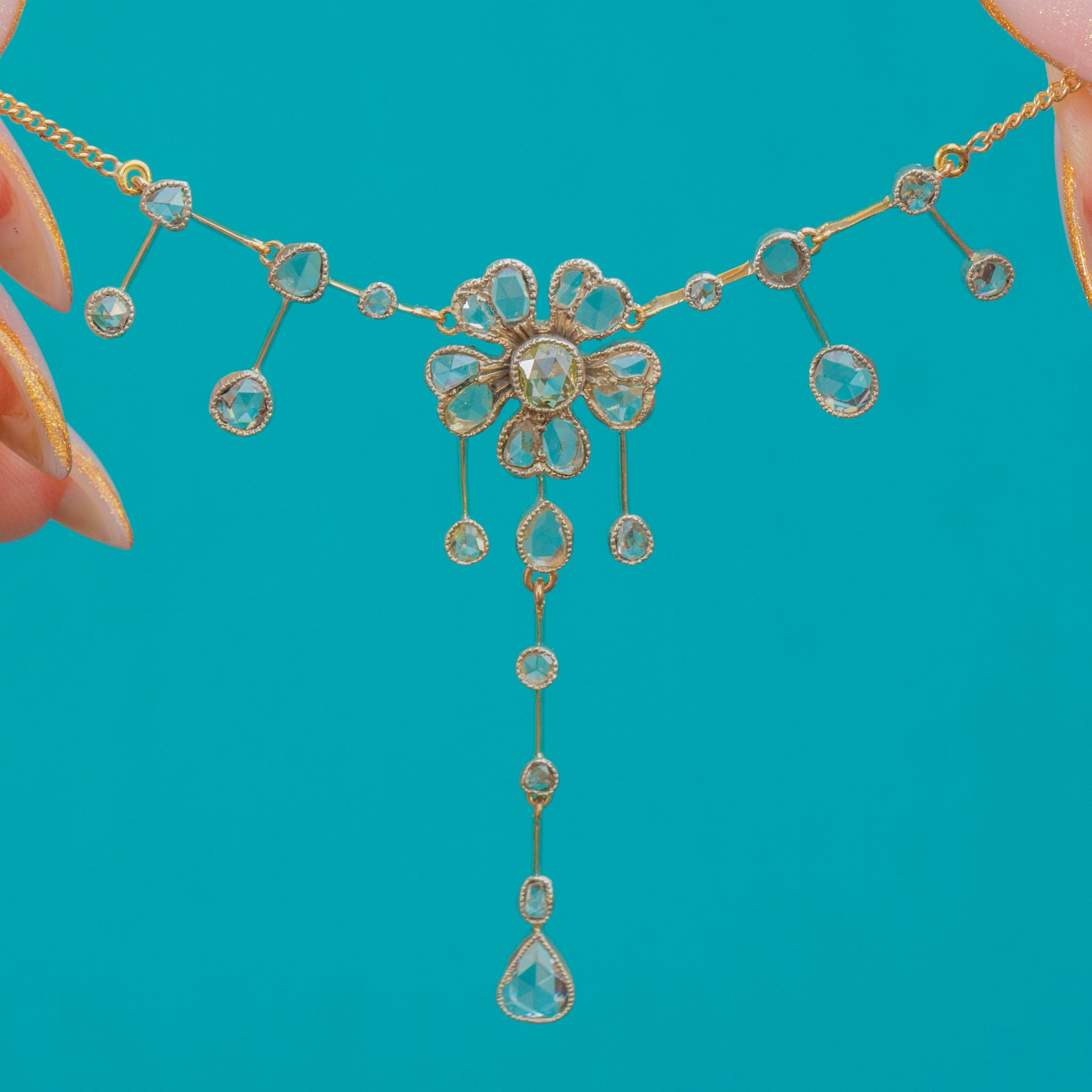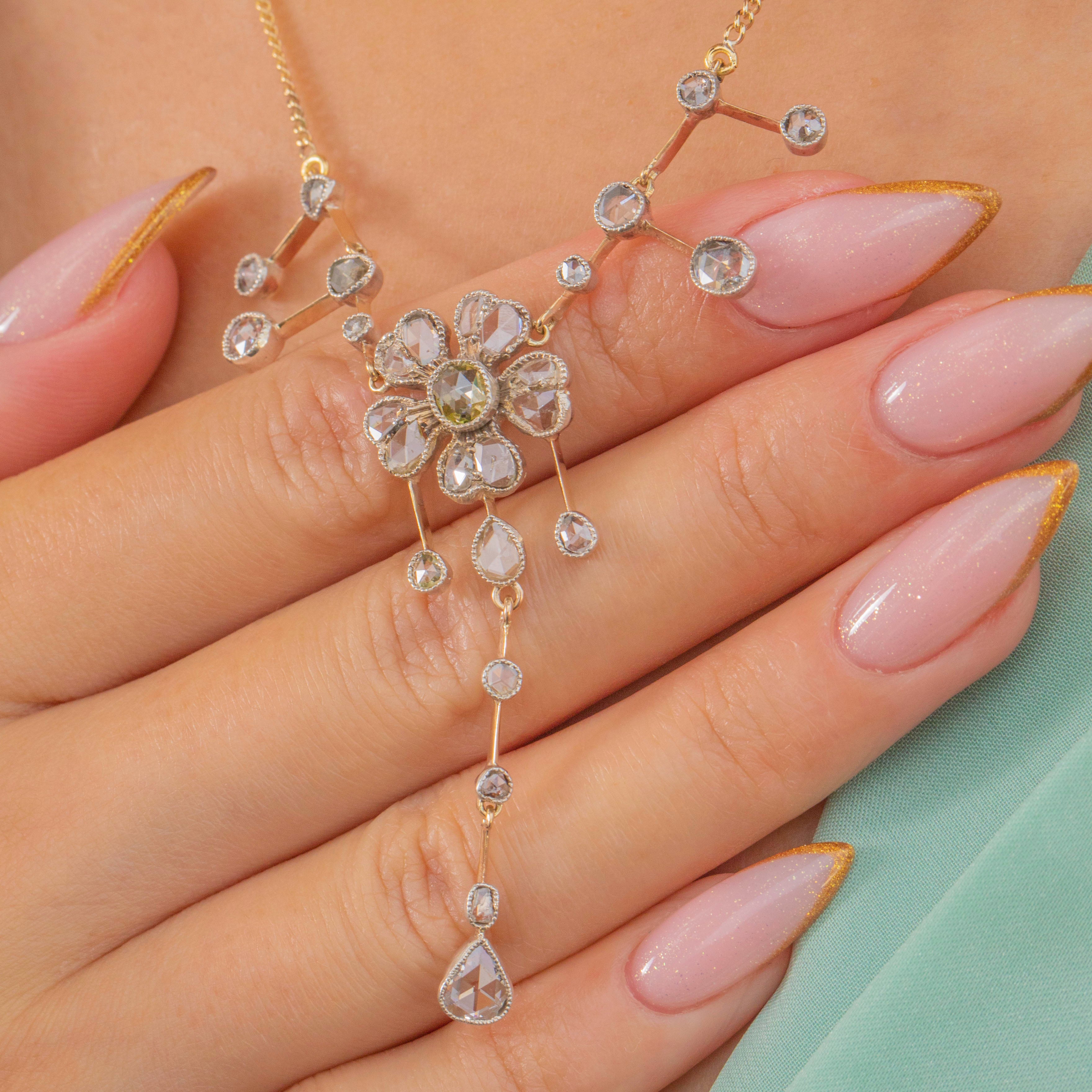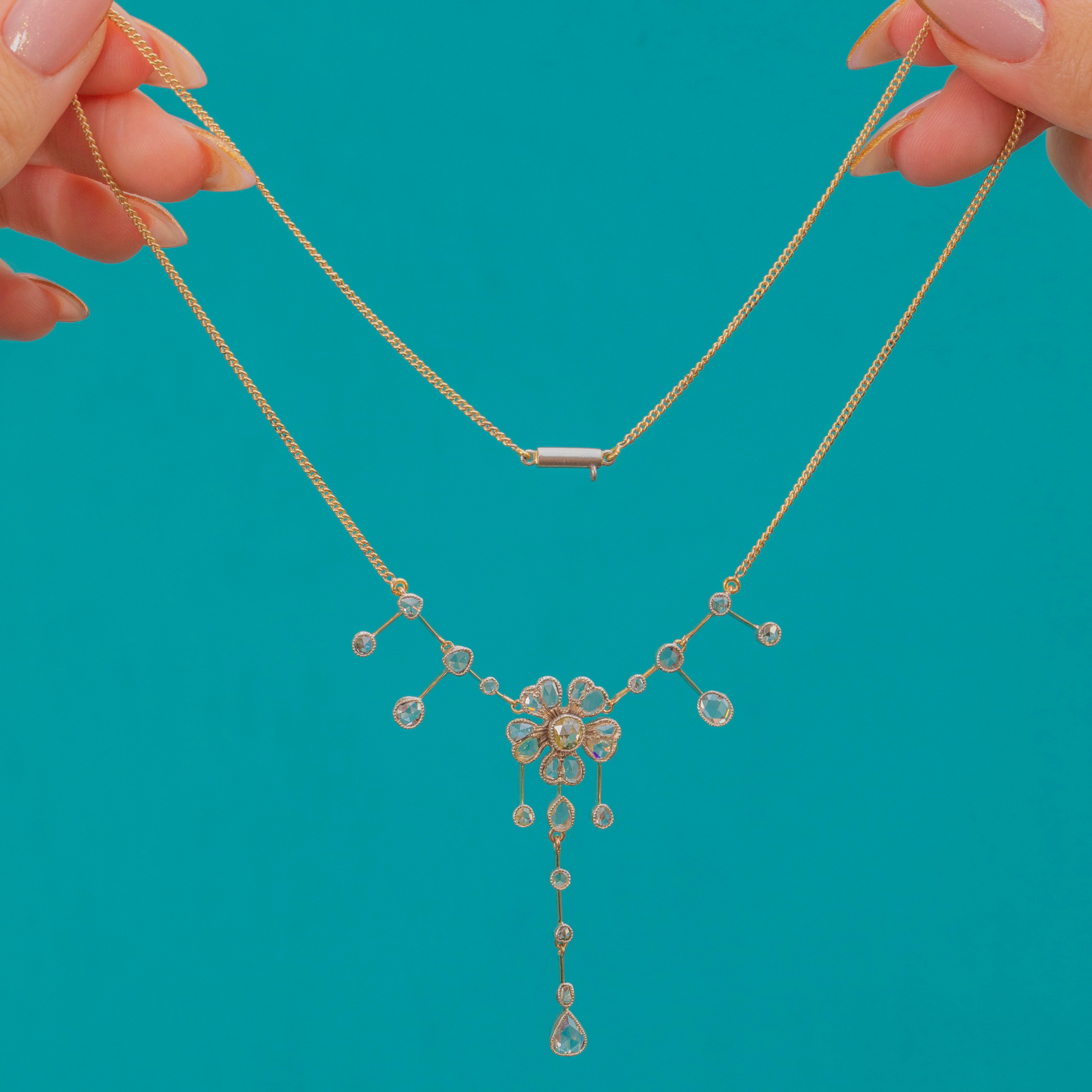 This breathtaking late Victorian necklace is an absolute showstopper, glittering with approximately 2.50 carats of rose-cut Diamonds arranged in an intricate floral and foliate design. The central flower motif radiates grace and delicacy, with articulated drops that dance beautifully in the light. Each Diamond, hand-cut and individually millegrain-set, showcases the unique charm and soft brilliance of antique stones.