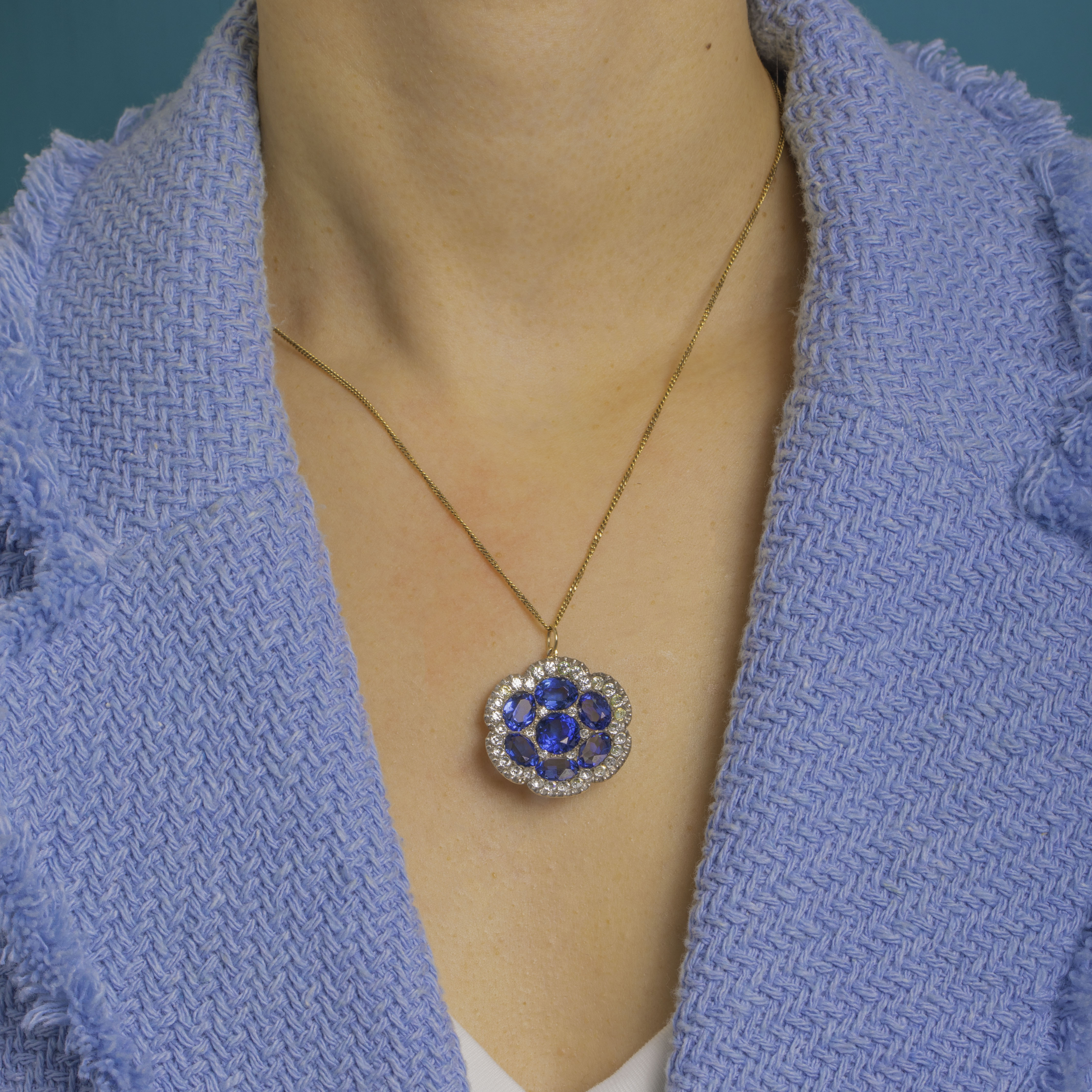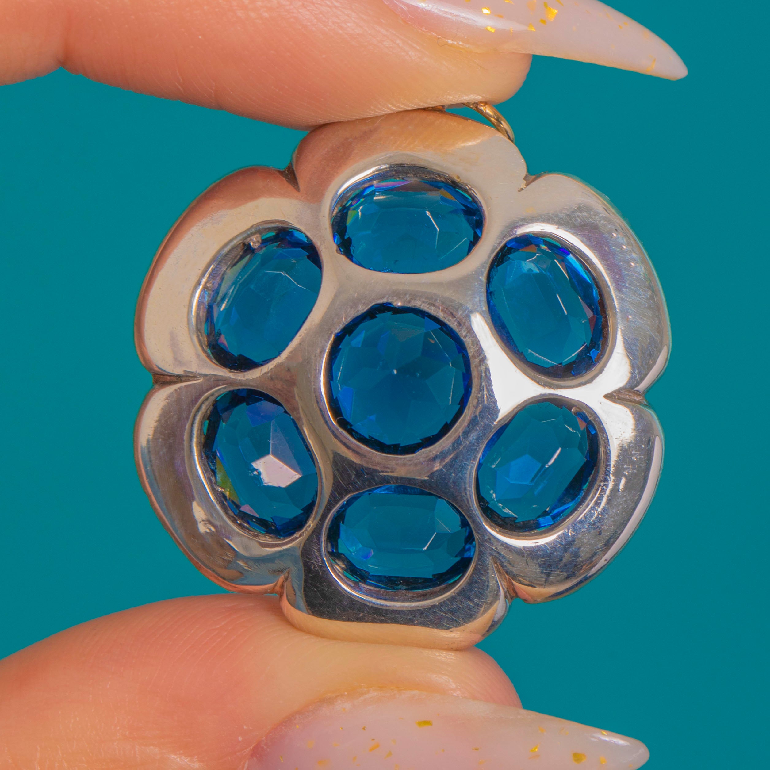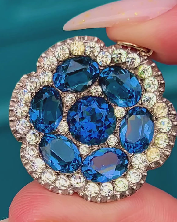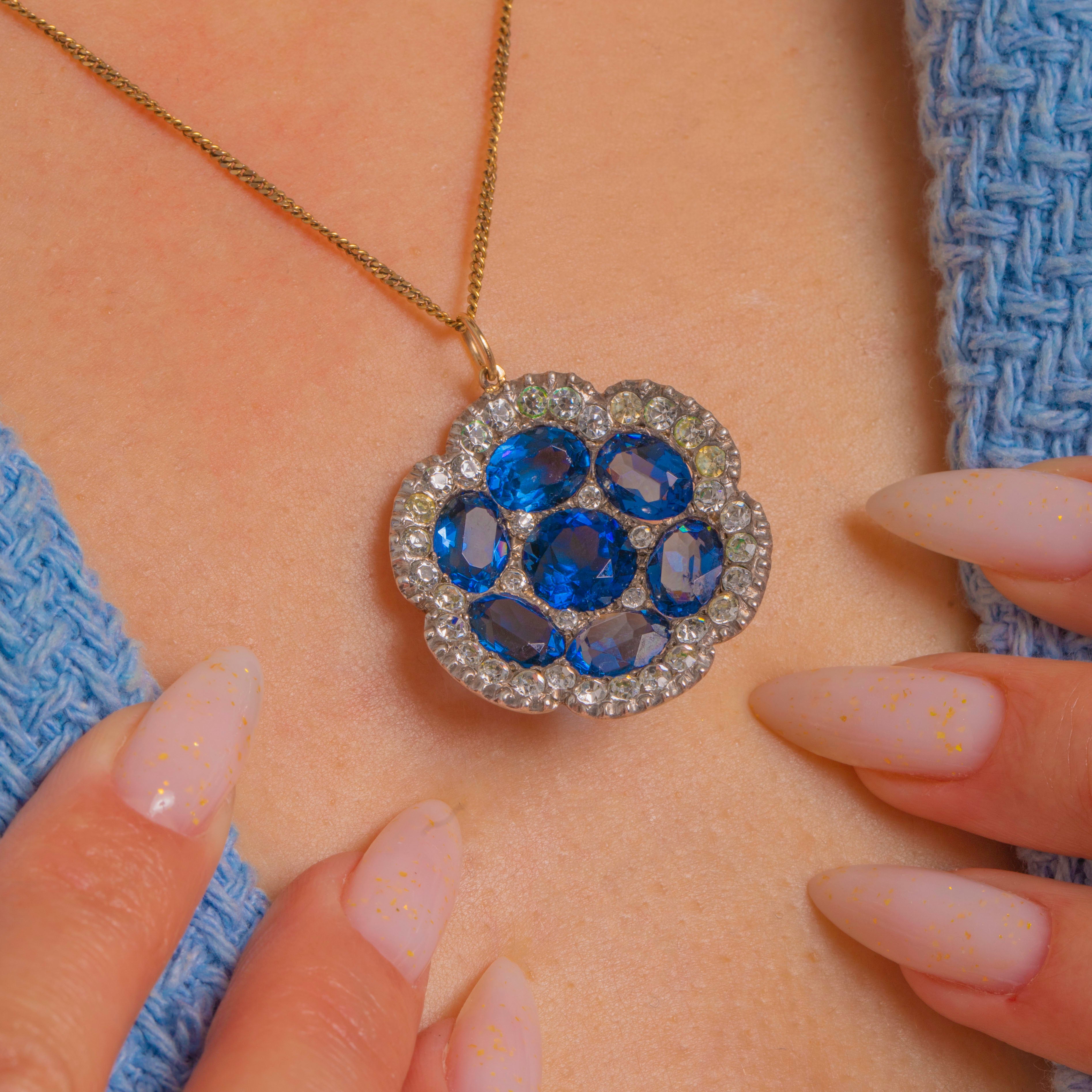 Alive with antique sparkle, this Victorian Silver flowerhead pendant blooms with seven deep royal‑blue Paste stones framed by a scalloped halo of bright White Paste. The saturated blue stones are beautifully contrasted by the crisp, halo for that classic rosette silhouette, framed by a pie crust border for a classic Victorian finishing touch.