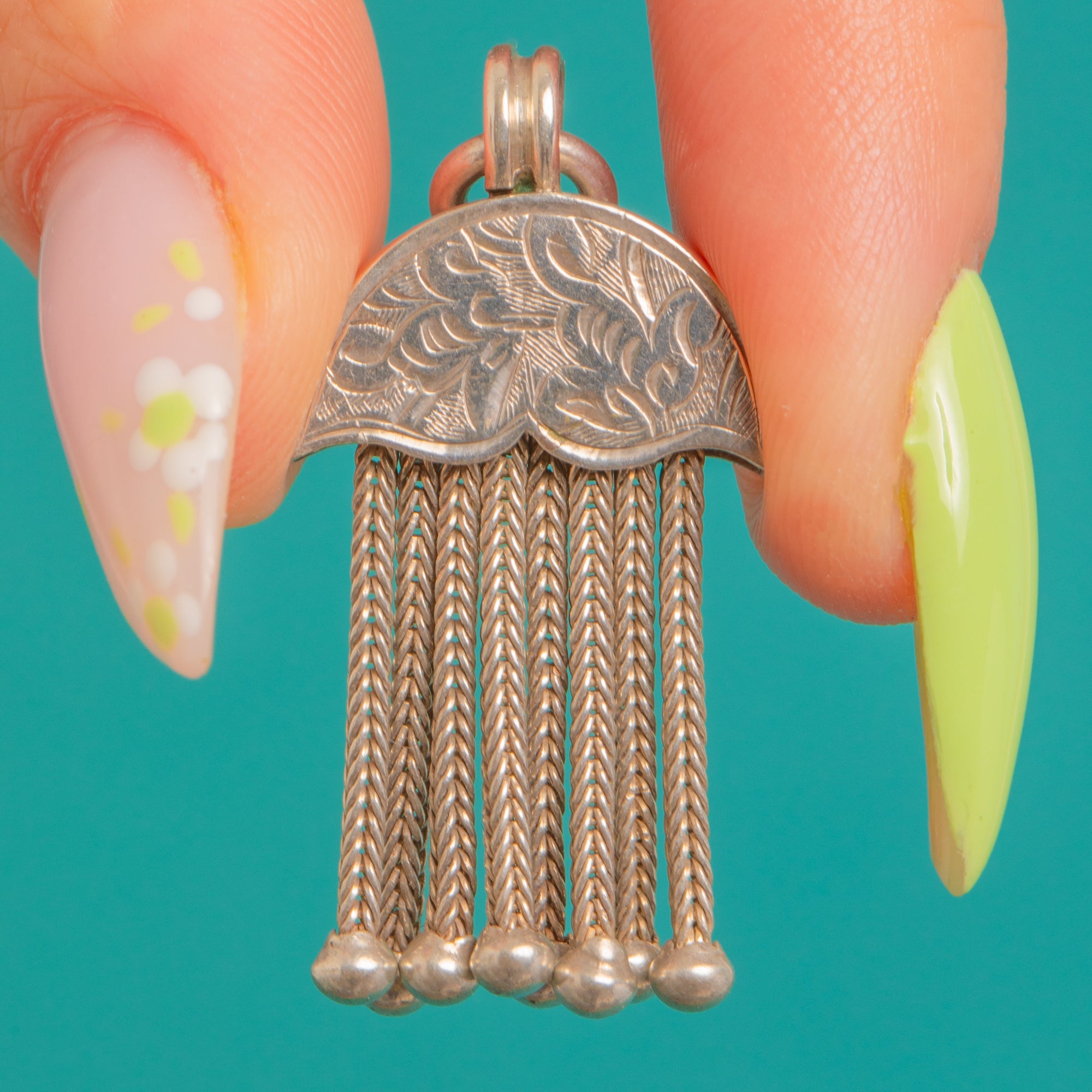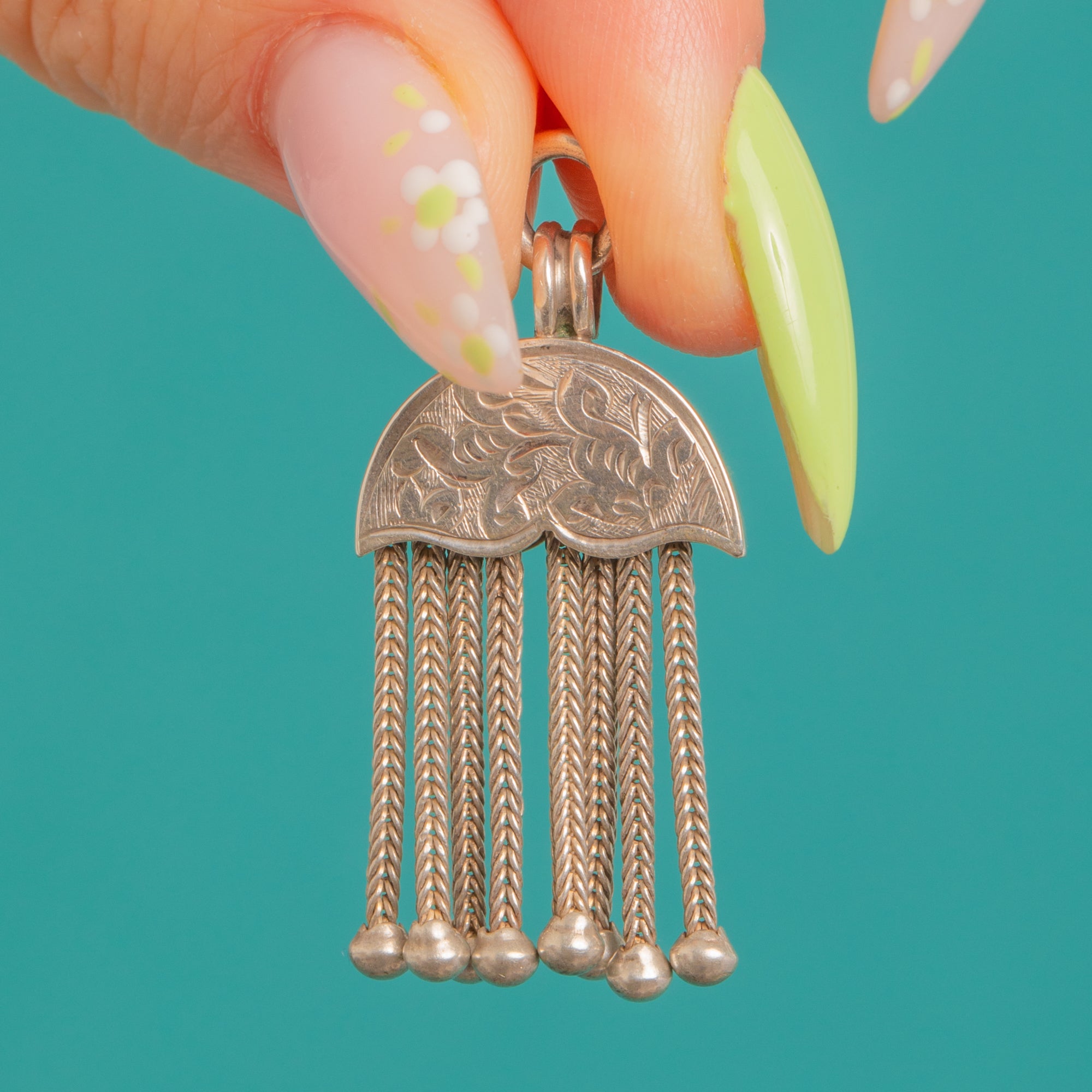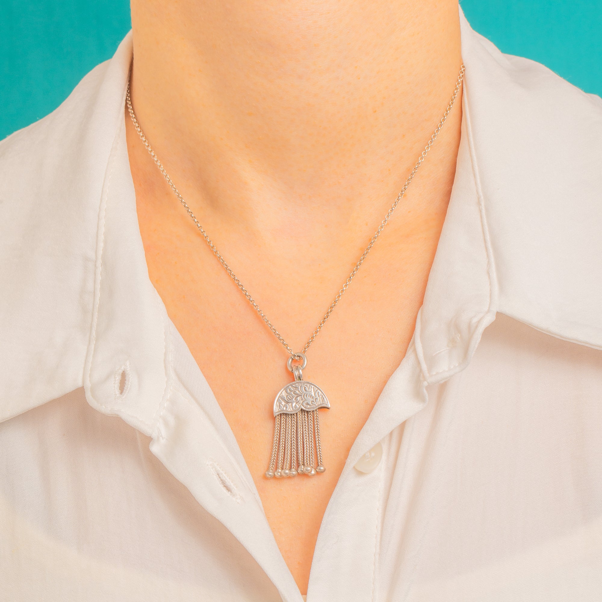 Delicate yet distinctive, this Victorian Silver crescent moon tassel pendant charms with its engraved half‑moon cap and scalloped edge, cascading into a liquid fringe of fine woven foxtail chain tassels tipped with tiny bead finials. The polished Silver gleams beautifully, while the soft patina in the recesses adds depth to the intricate foliate and scroll detail.