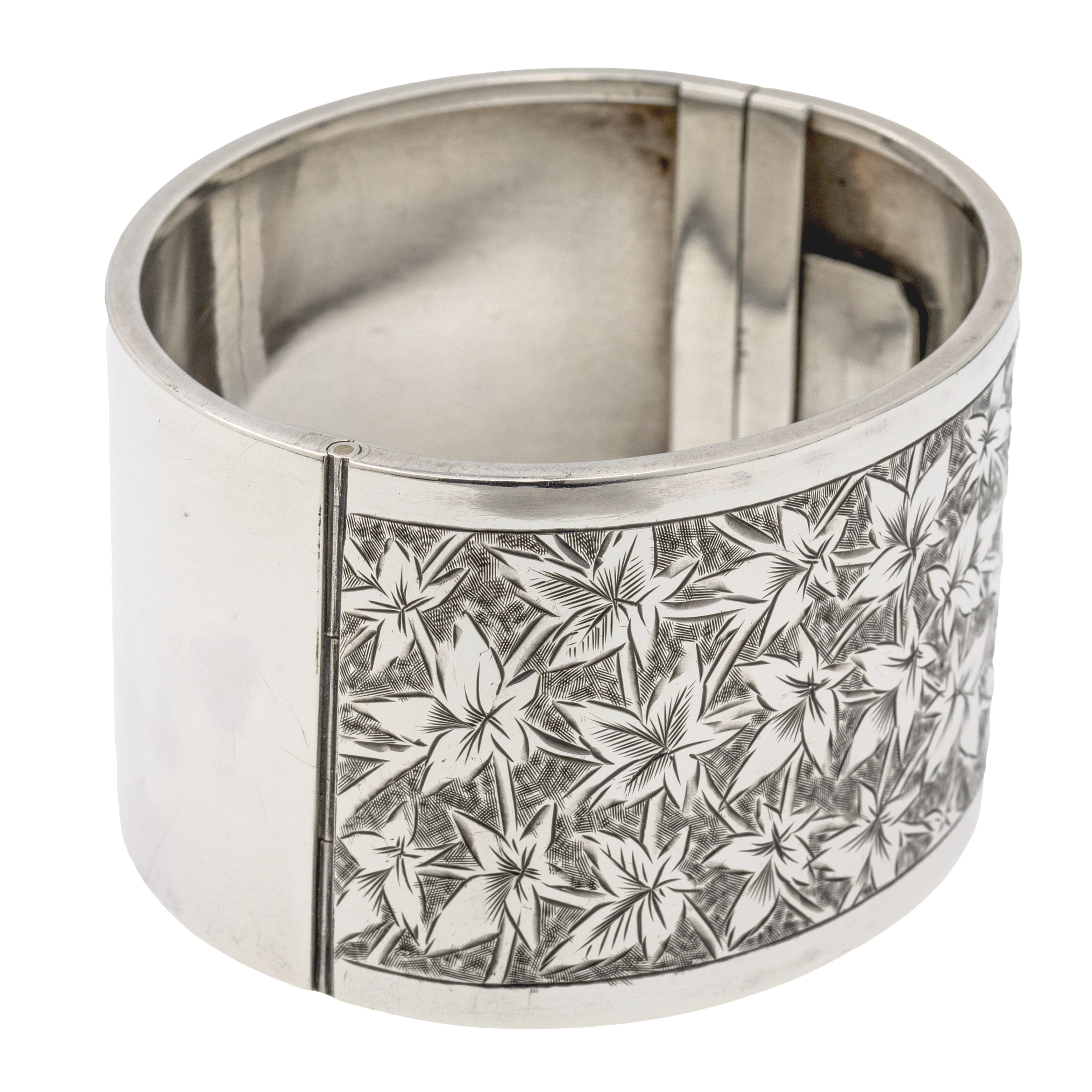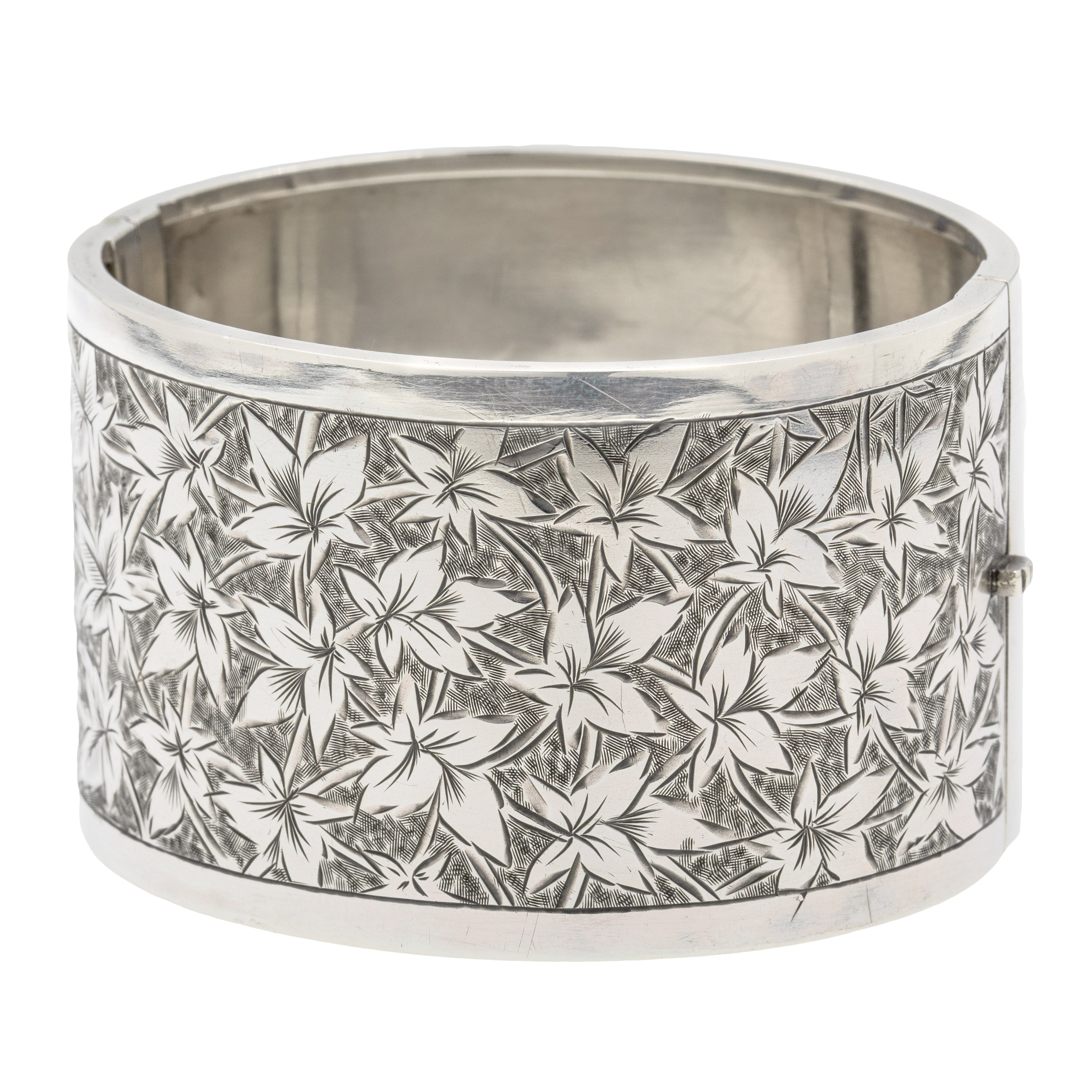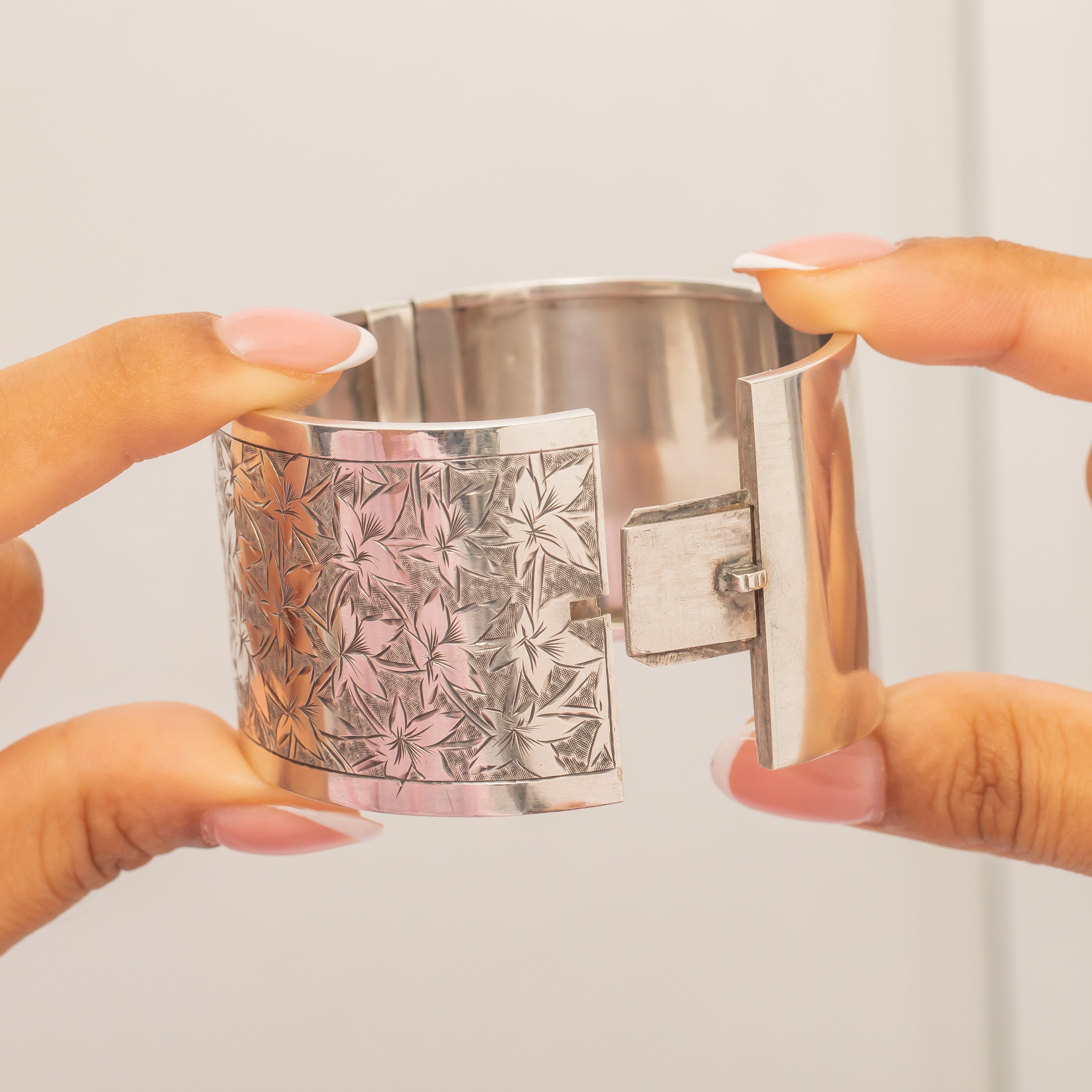 Make a statement wherever you go with this outstanding Victorian Silver engraved ivy leaf bangle! Crafted from solid Sterling Silver with intricately engraved ivy leaves sweeping across her front, this antique cuff bangle will provide you with ample wrist coverage.