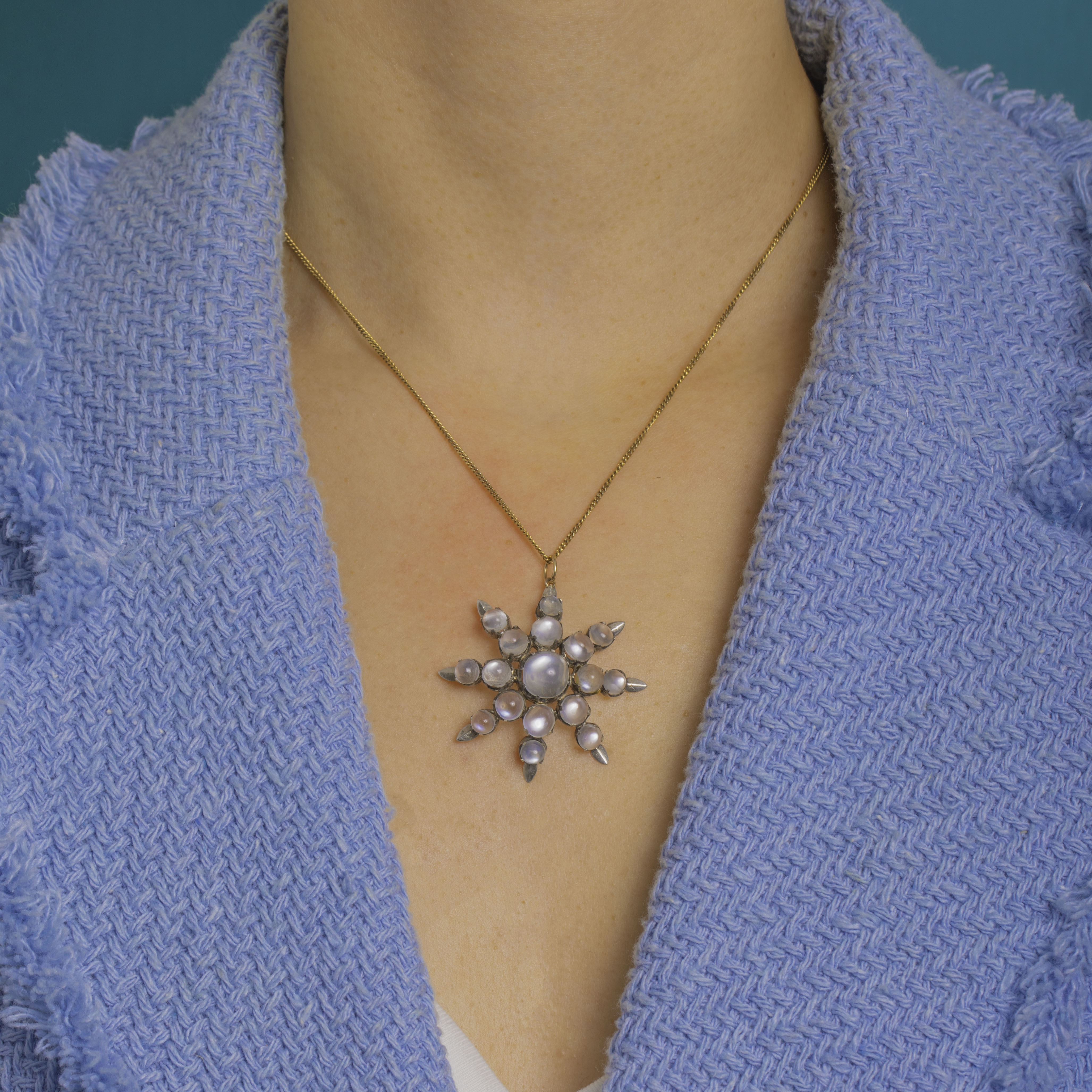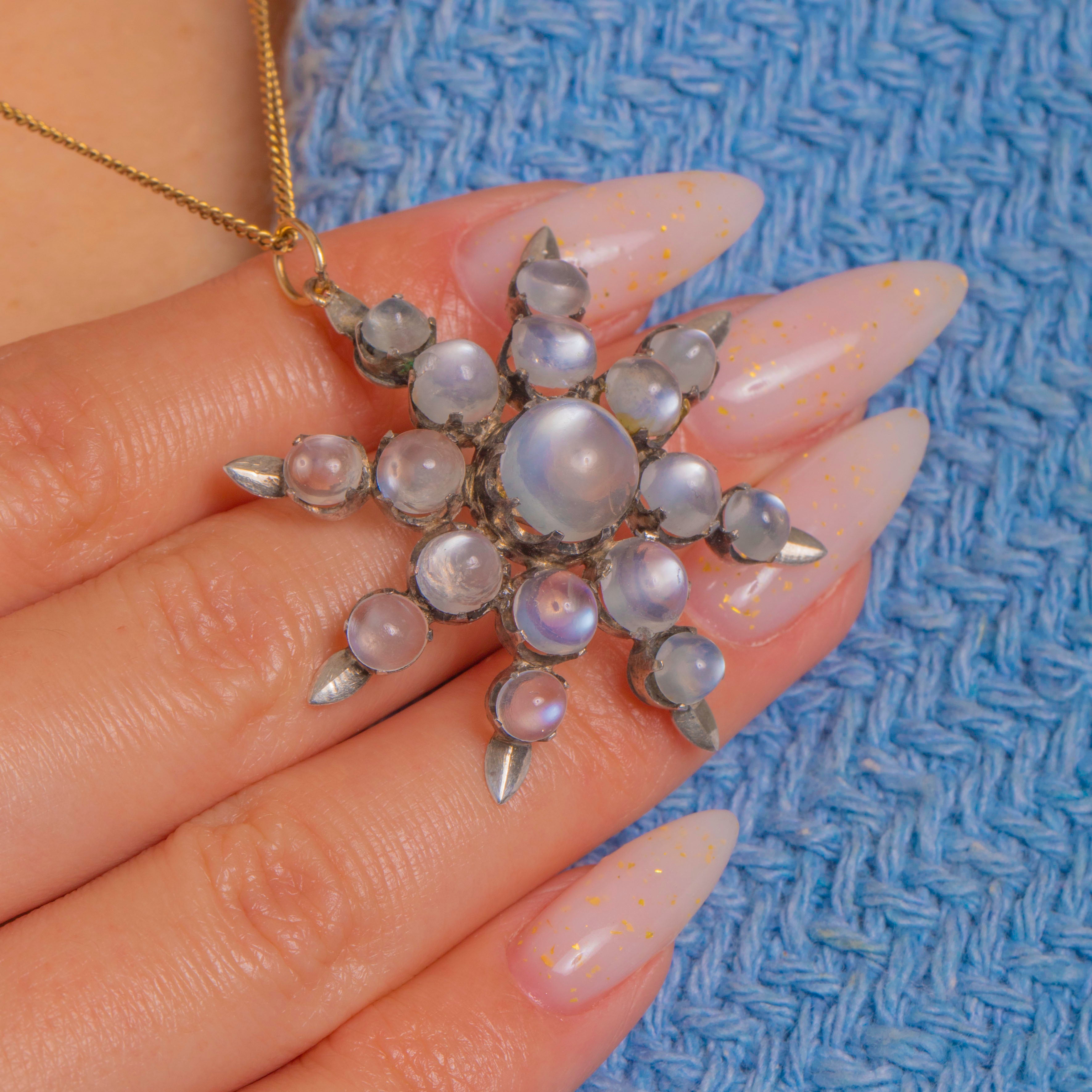 A luminous Victorian starburst pendant, set with a constellation of graduated Moonstone cabochons that shimmer with an ethereal blue-lilac glow. Each domed gem is nestled in tall, claw settings that radiate from a larger central stone, creating a striking celestial silhouette in softly patinated Silver.