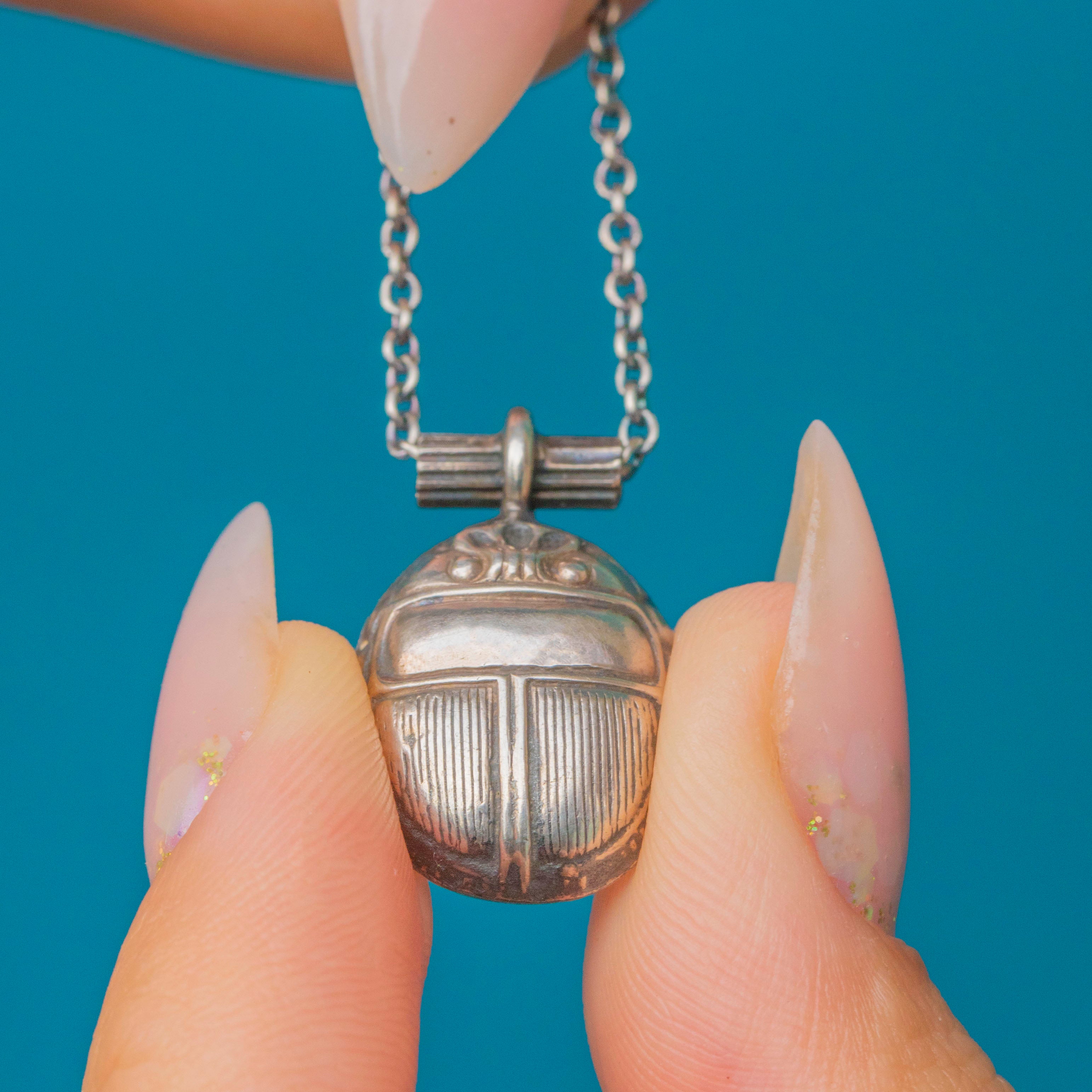 Egyptian Revival jewellery was beloved in the Victorian era, and this striking Silver scarab pendant captures the fascination with the ancient world. Scarabs symbolised renewal and protection, and this example has a wonderful boldness in its smooth, domed body and ribbed detailing.