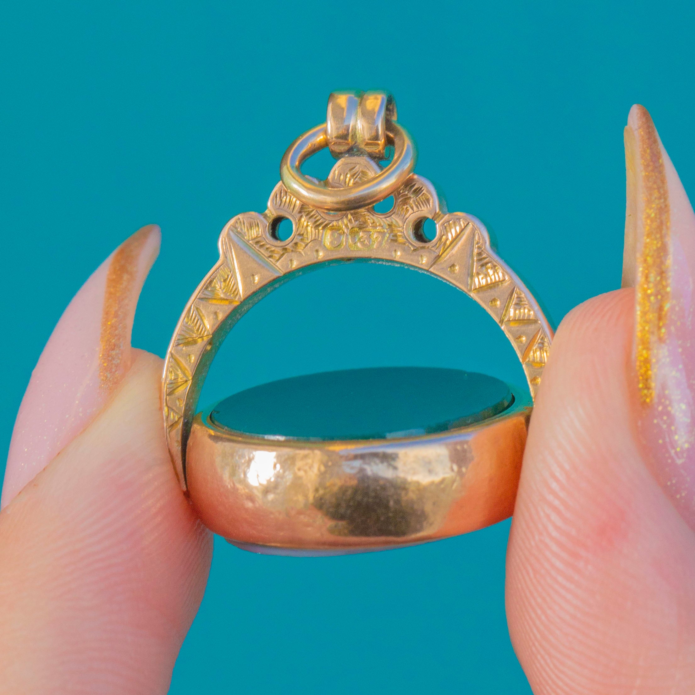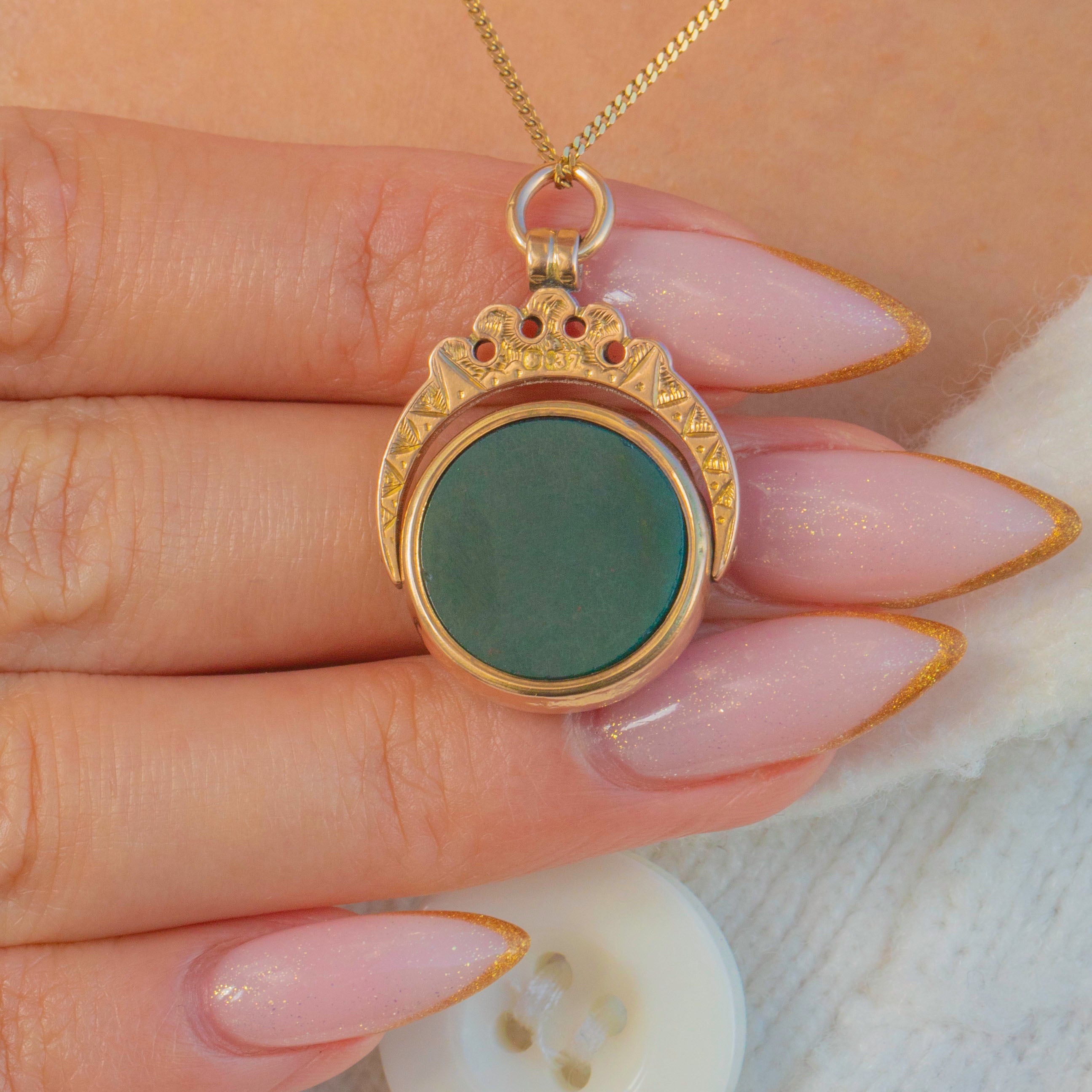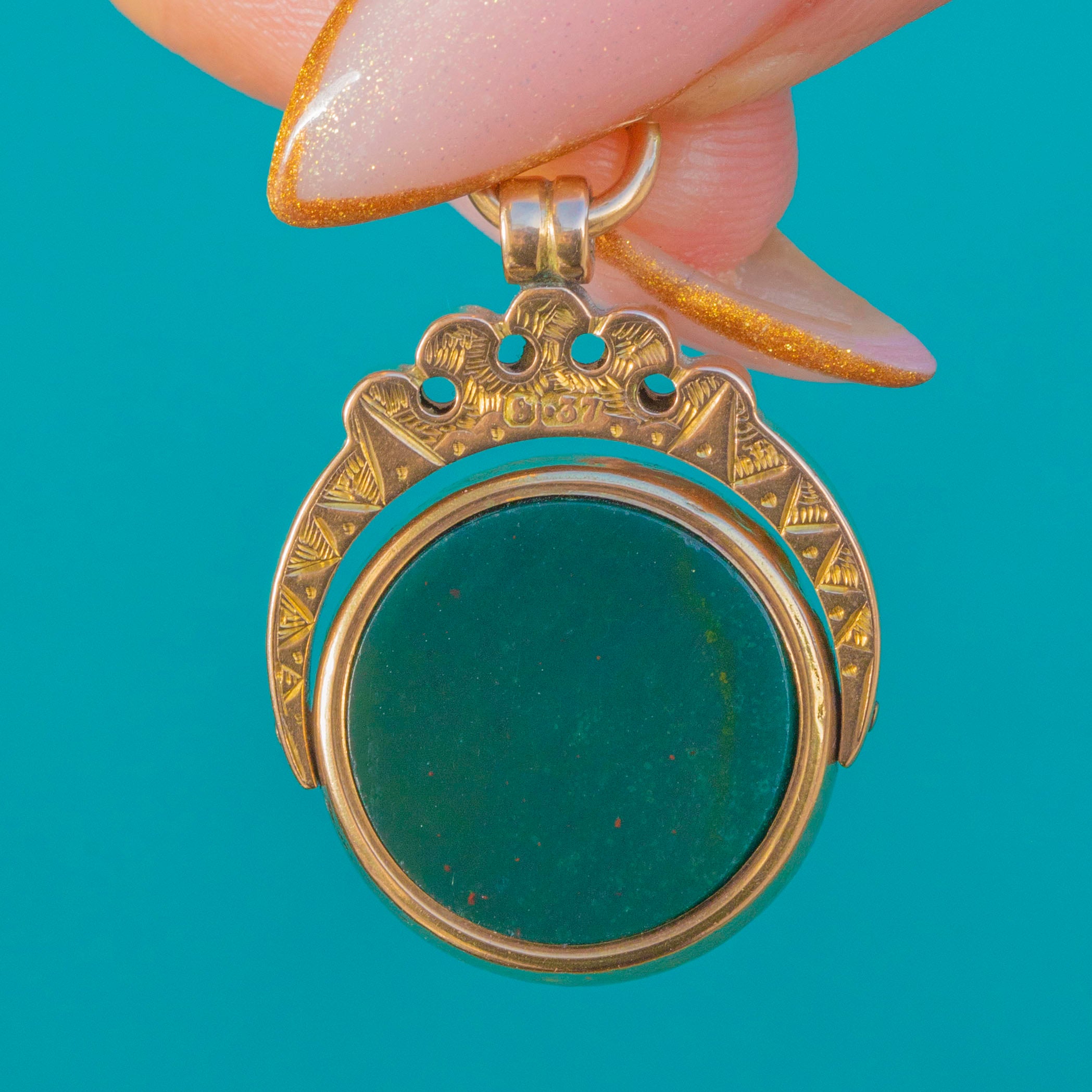 EXCELLENT: Both Bloodstone and Chalcedony panels are smooth, glossy and free from chips or cracks. The 9ct Gold frame and swivel mechanism are strong and in perfect working order, with only light surface wear and gentle patina consistent with age.