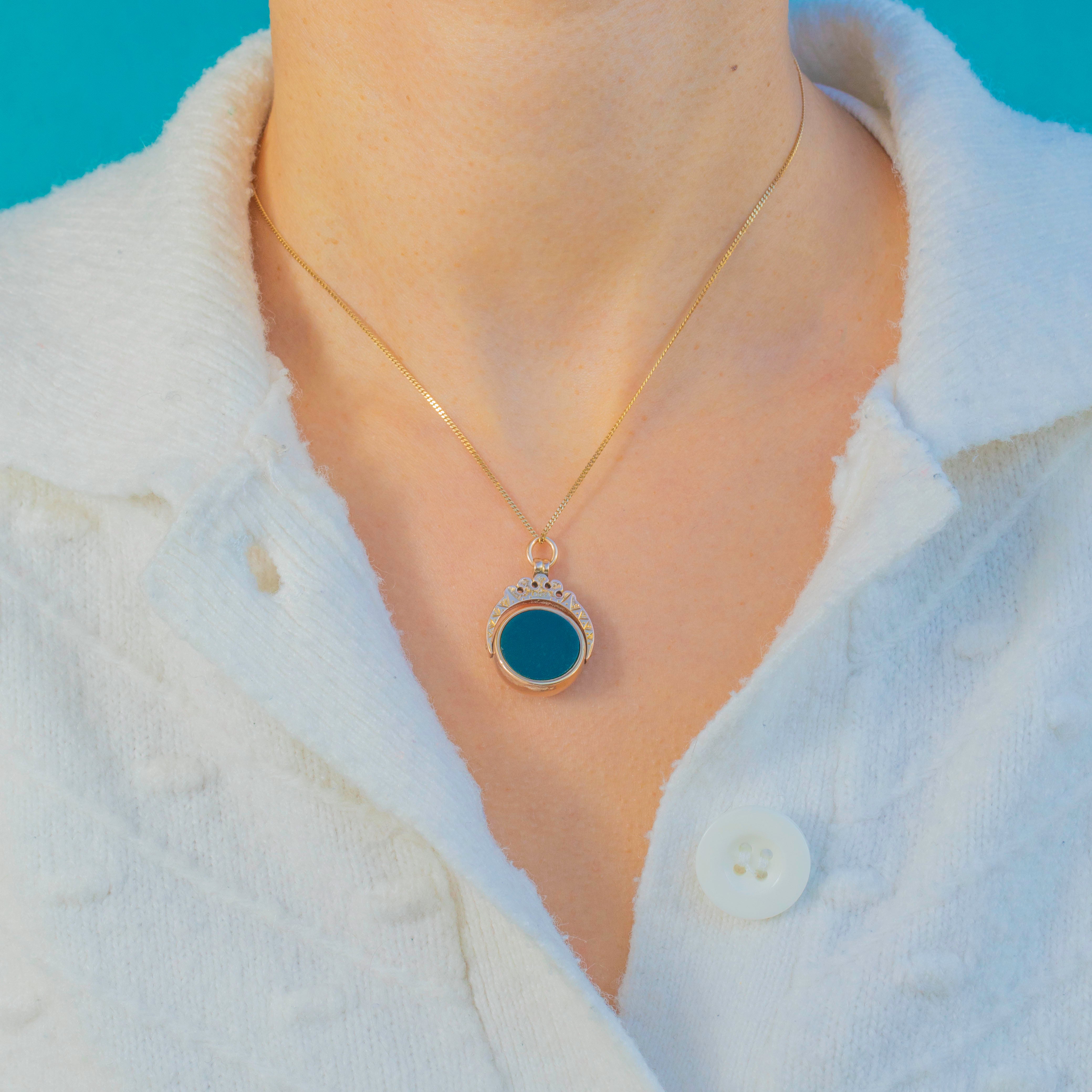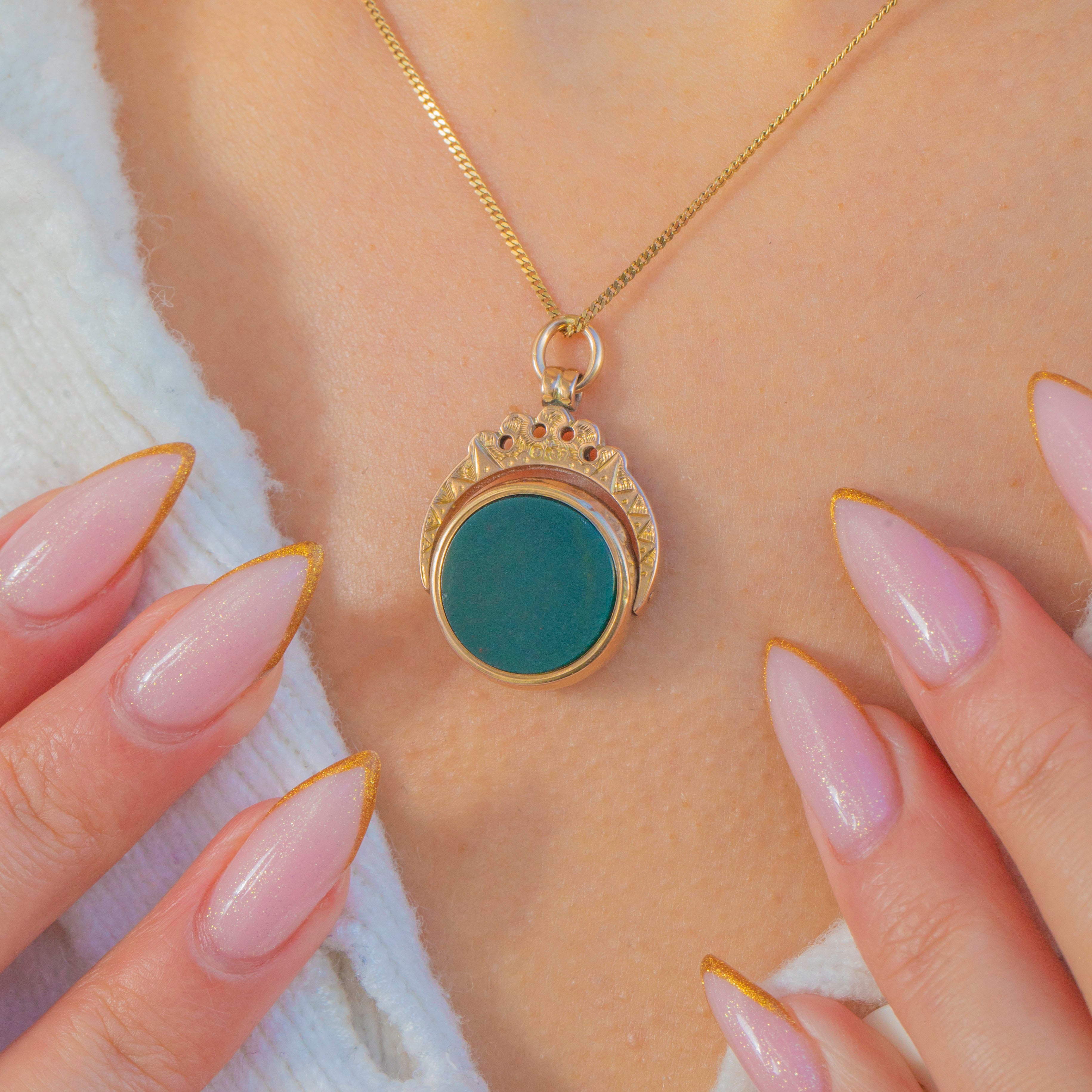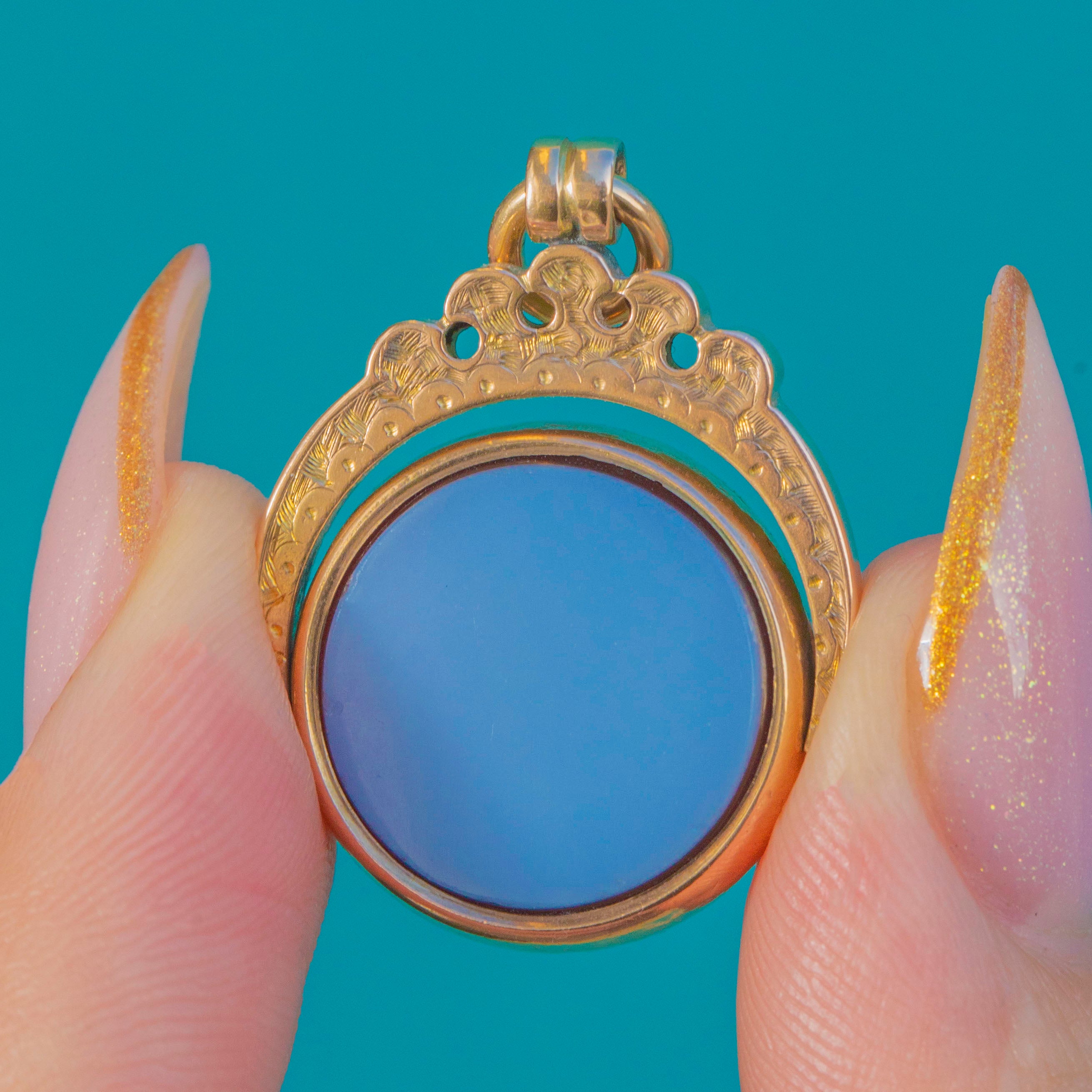 This lovely Victorian 9ct Gold spinner fob is set with two classic gemstones: inky green Bloodstone to one side and soft blue Chalcedony to the other. The circular panels swivel smoothly within a decorative Gold frame, giving you two distinct looks in one timeless antique jewel.