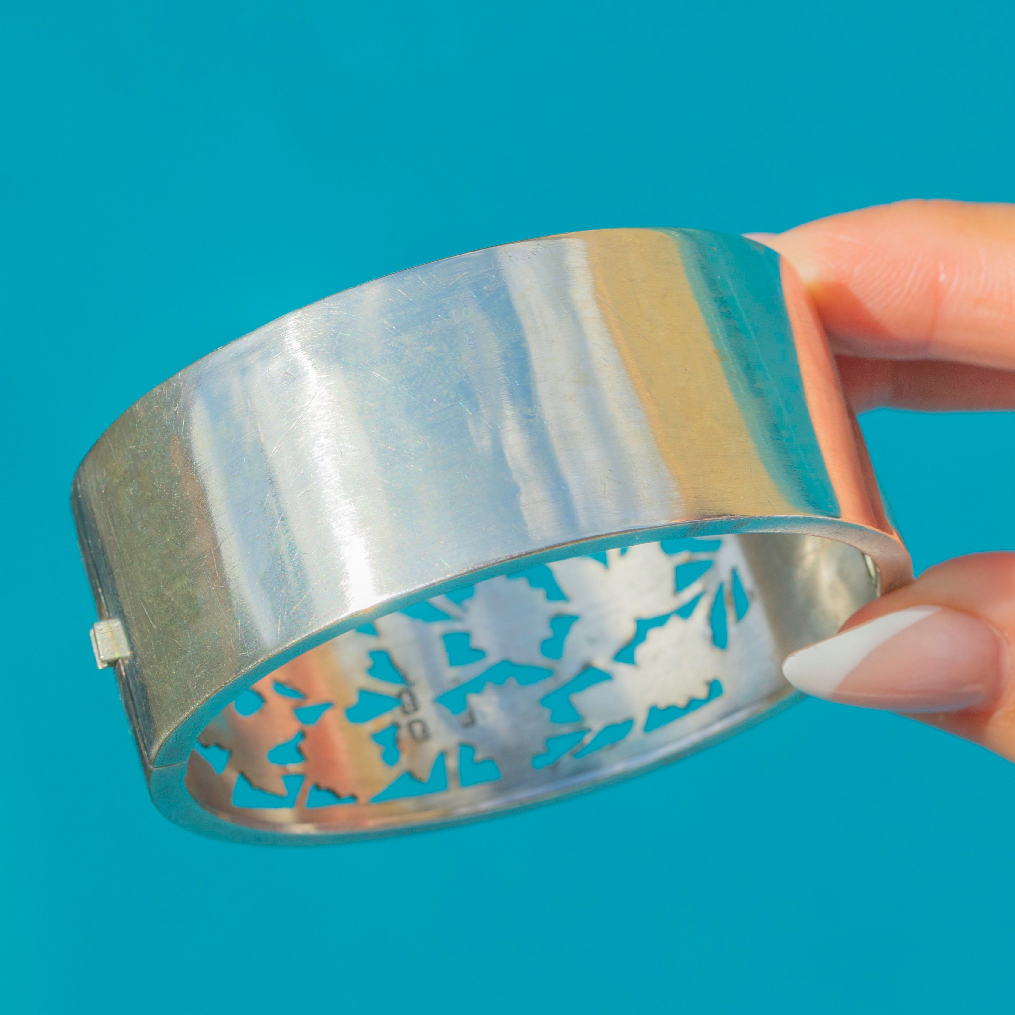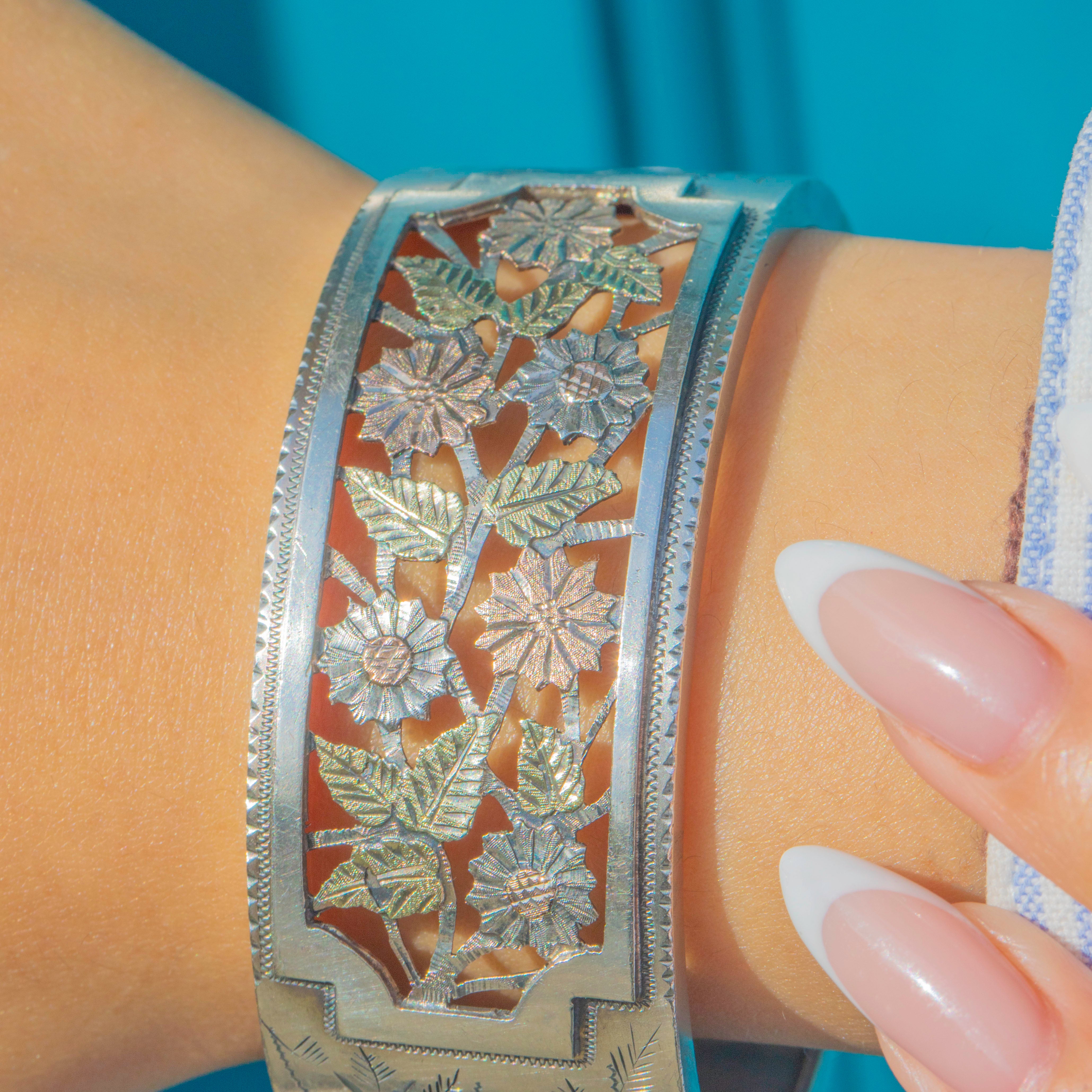 EXCELLENT: The bangle has survived in remarkable condition, especially considering its intricate filigree design. The 9ct Gold daisies and leaves remain crisp and vibrant, with no losses or wear to the applied details. The hinge is firm, the clasp closes securely with a satisfying click, and the Silver is bright with only minimal surface wear. A true collector’s piece, as rare as it is beautiful.