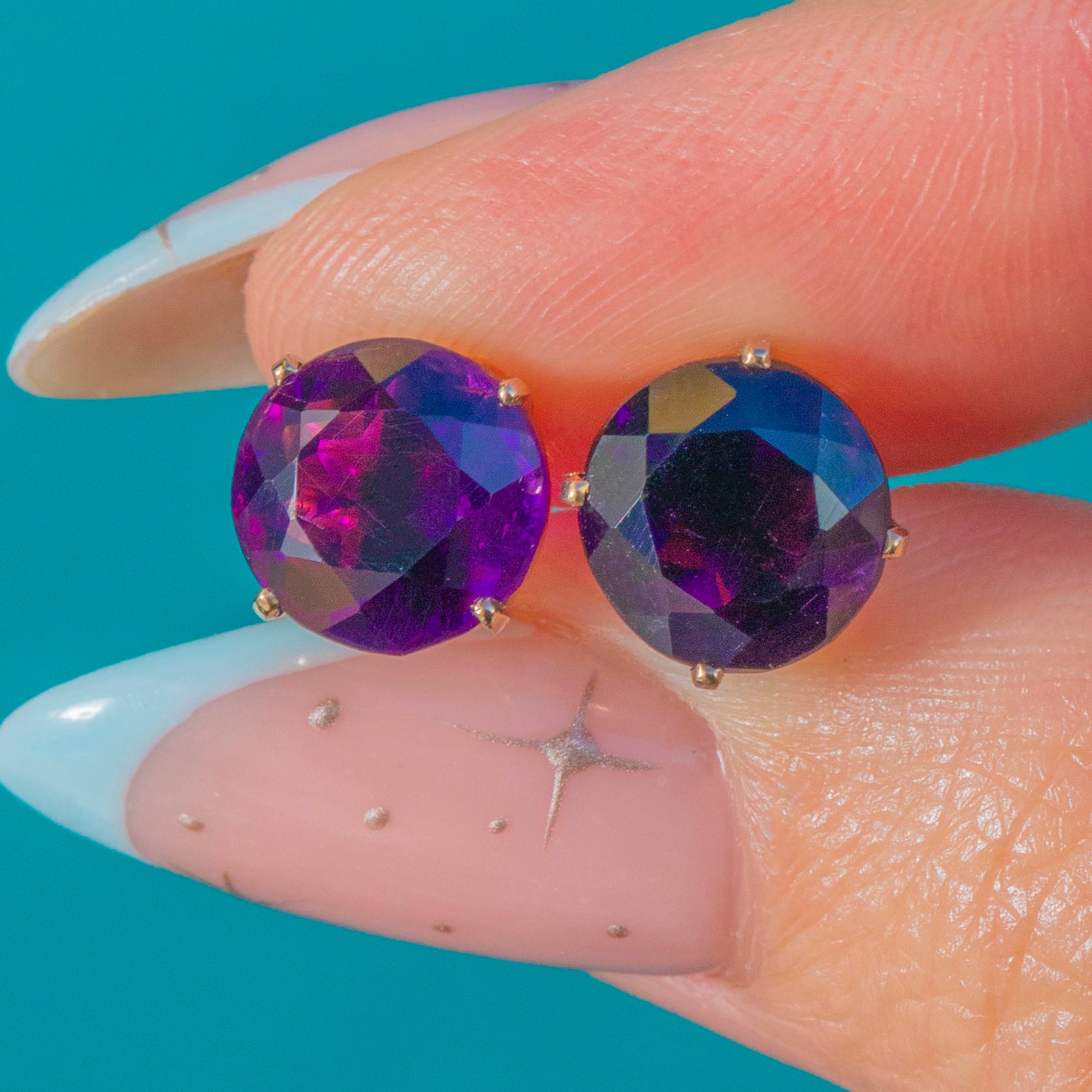 Classic and compelling, these Vintage stud earrings showcase two rich, deep plum Amethysts in timeless four-claw open basket mounts of 9ct Gold. The round brilliant cuts flash with vivid violet and magenta tones, offering luminous colour and elegant sparkle from every angle.