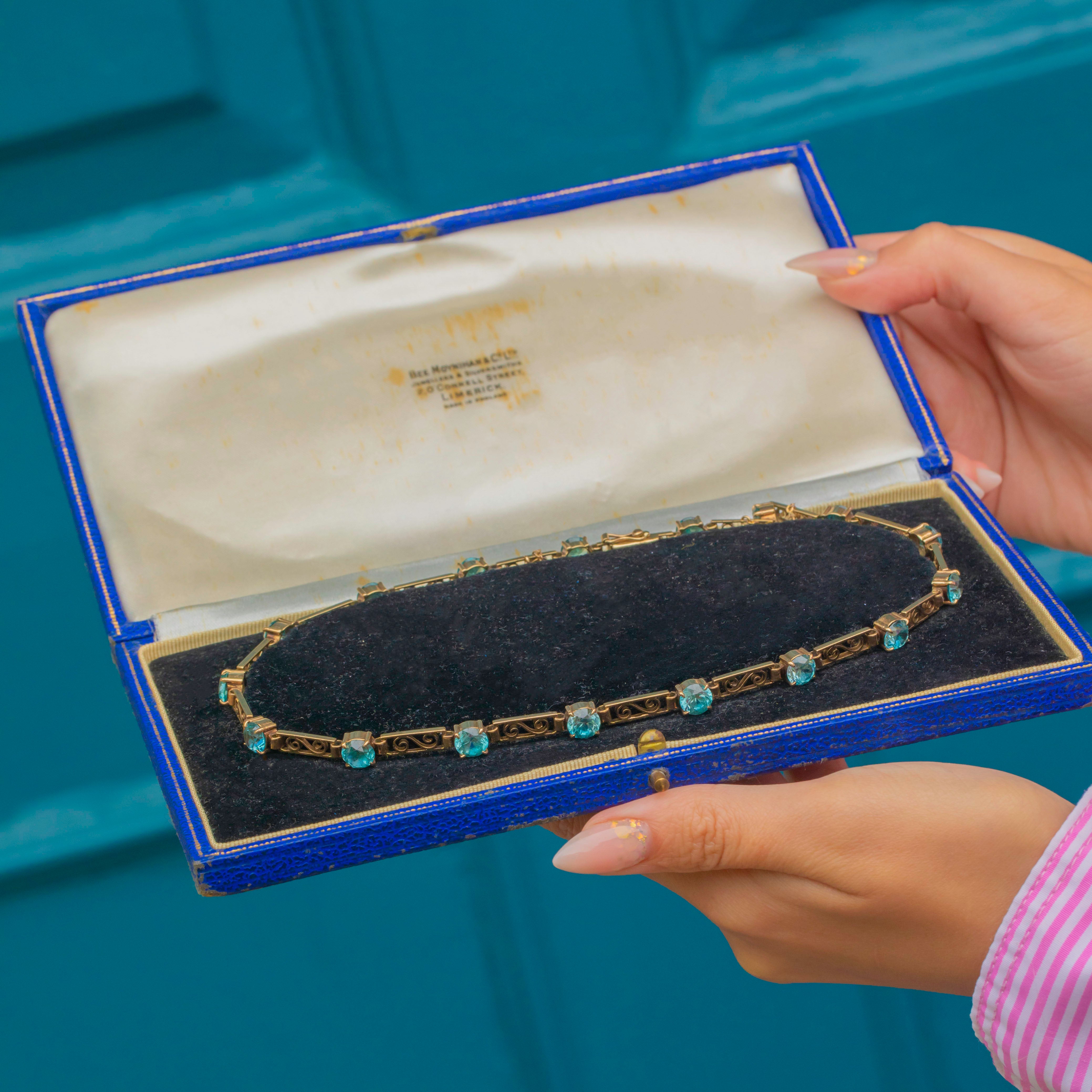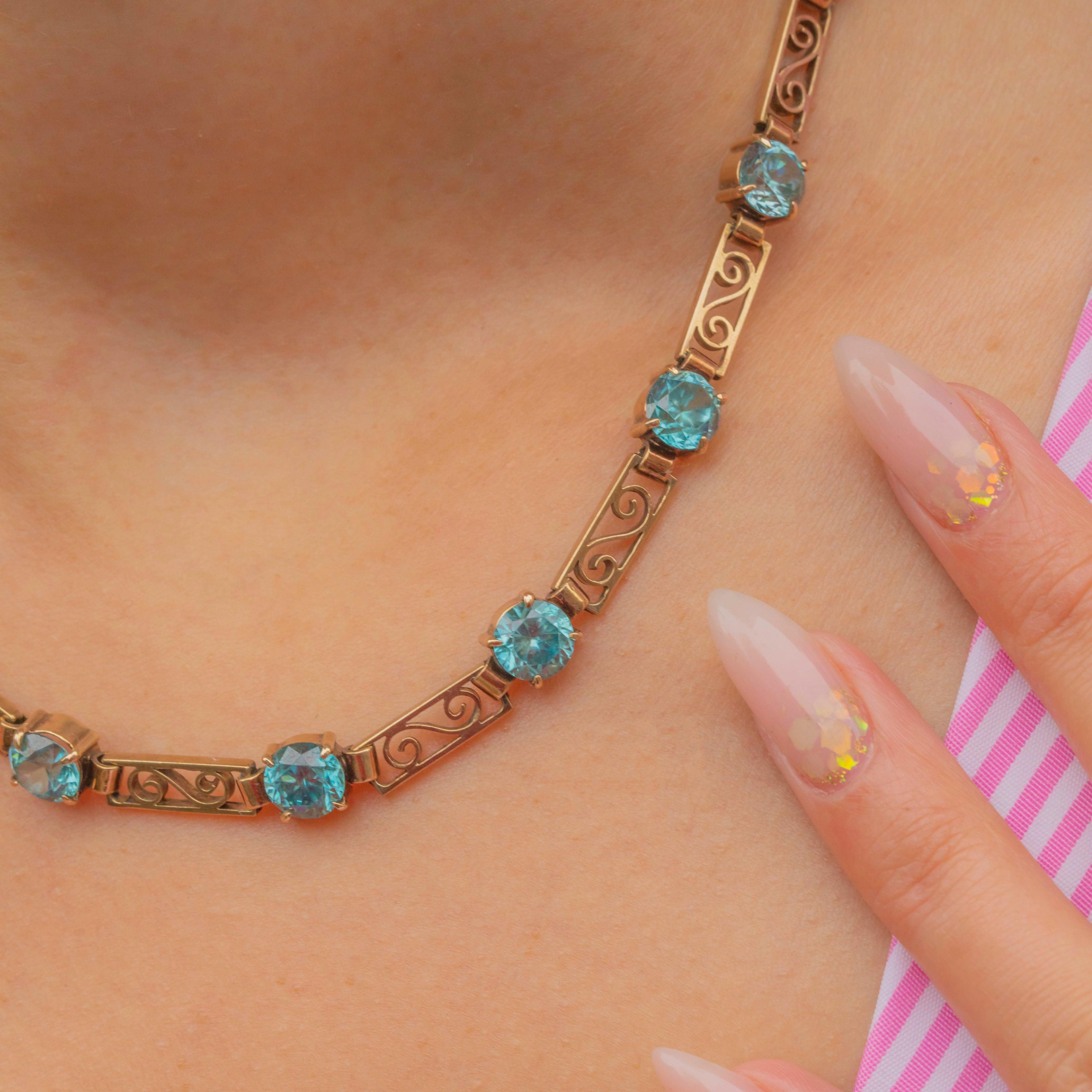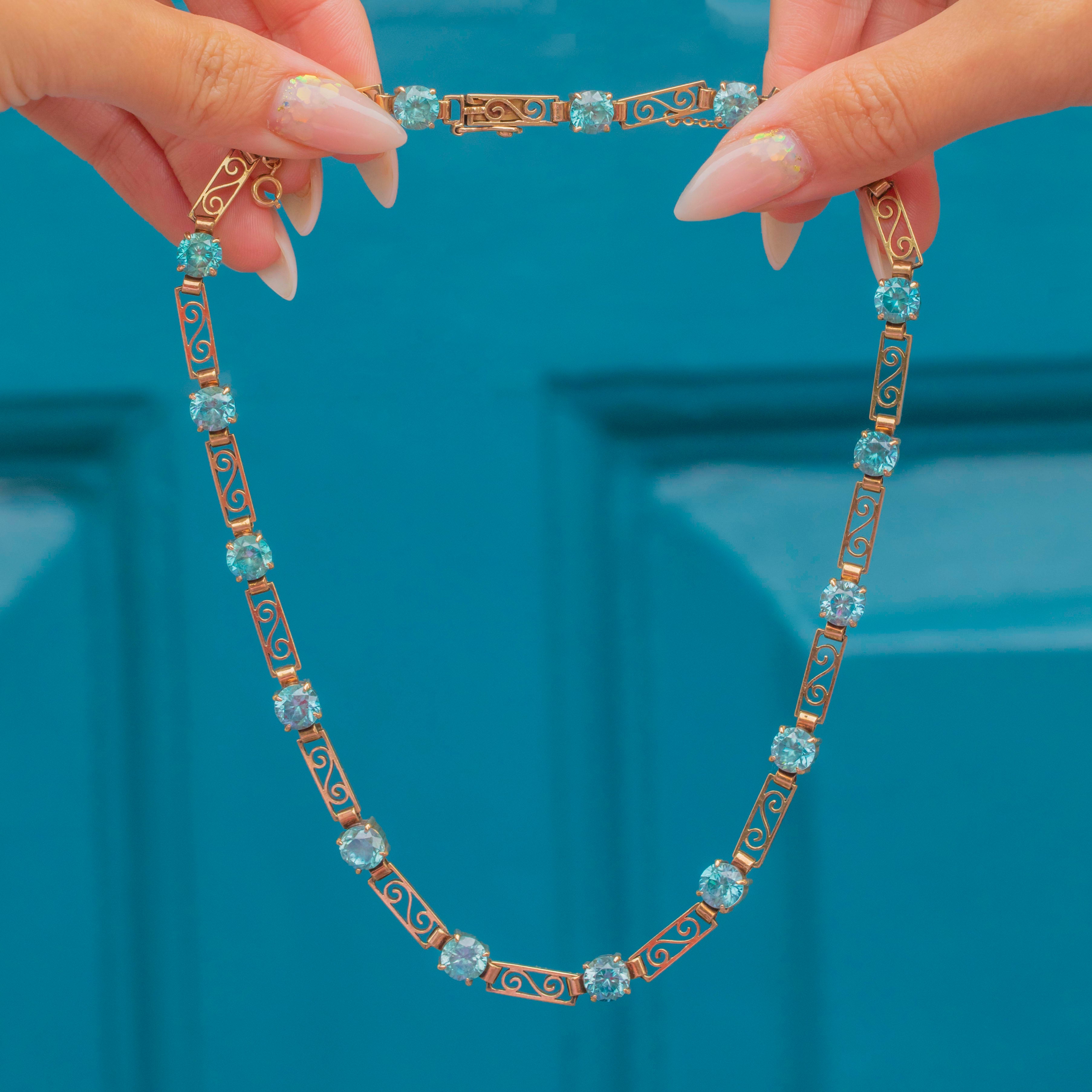 This beautifully made necklace sparkles with 17 round Zircons, each carefully claw-set to showcase their bright teal-blue colour and brilliance. Complete with a secure clasp and safety chain, it’s a statement piece of post-war British design and craftsmanship.