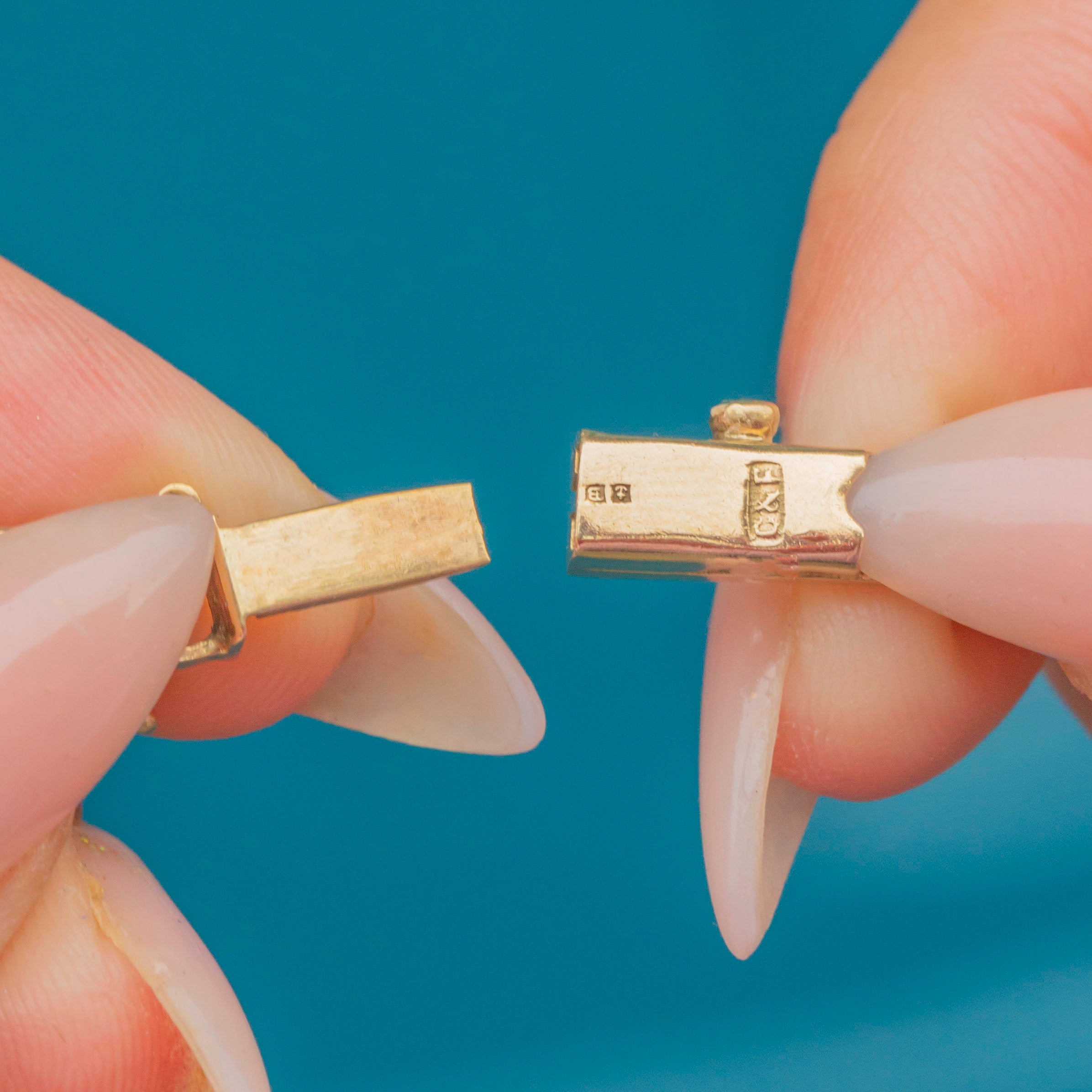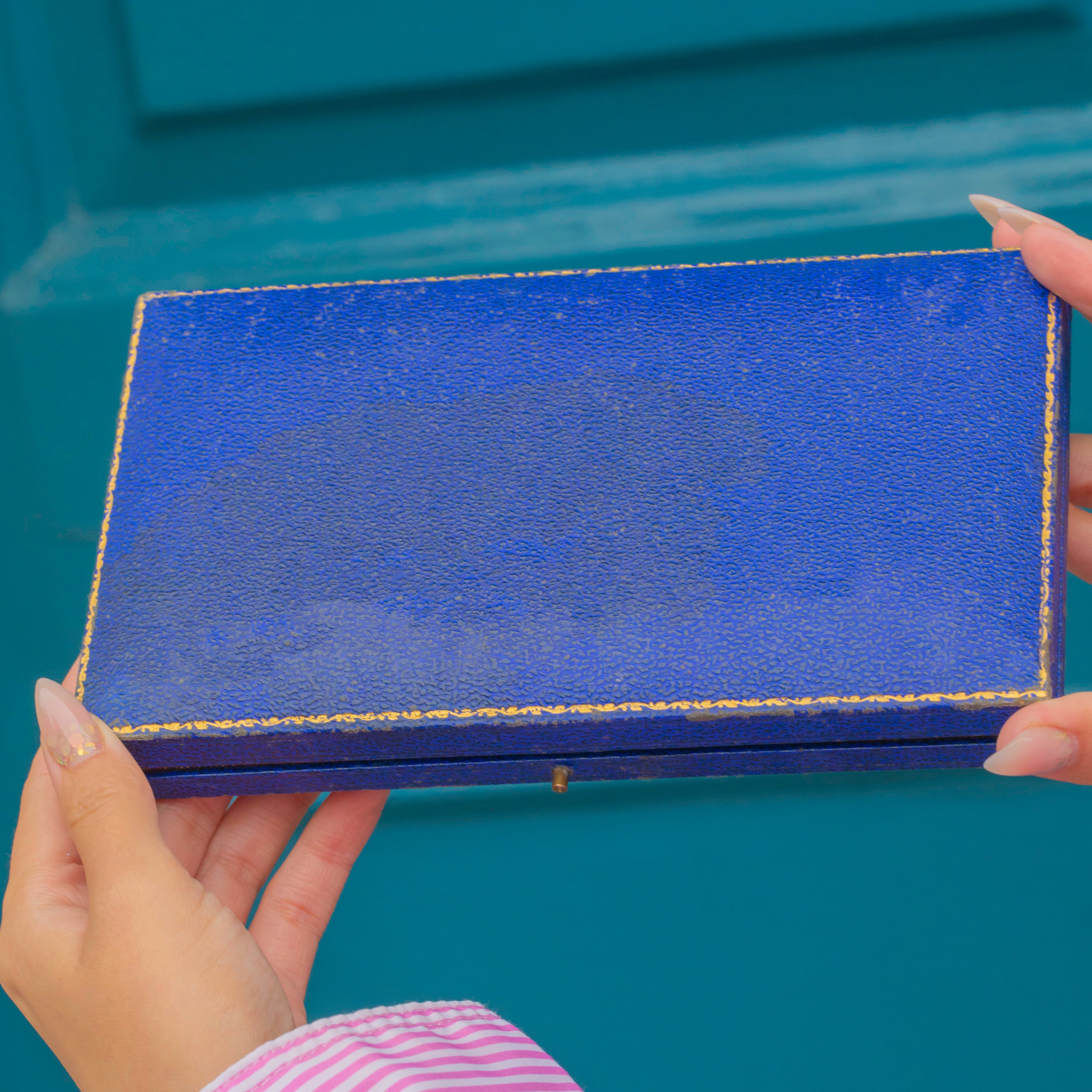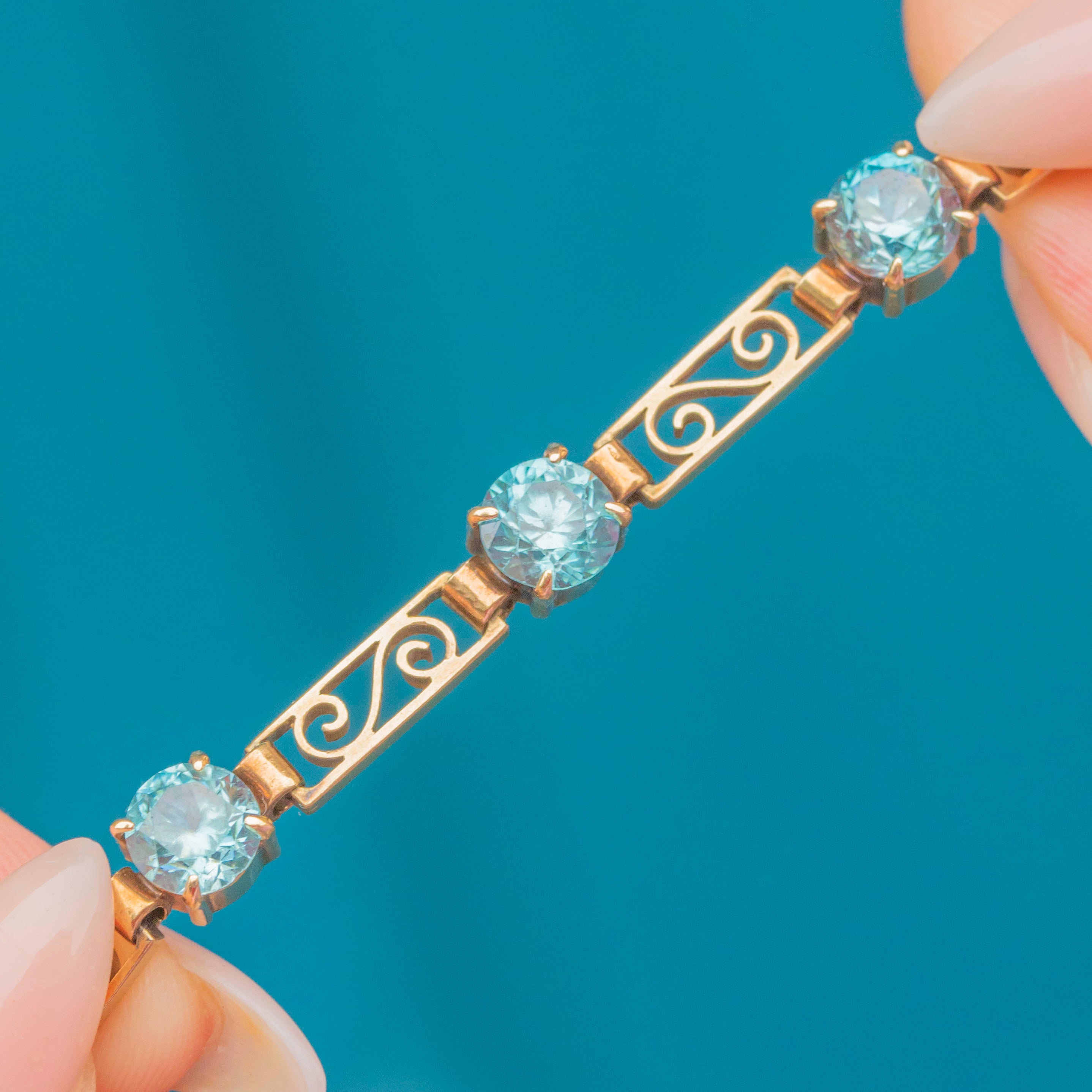 This beautifully made necklace sparkles with 17 round Zircons, each carefully claw-set to showcase their bright teal-blue colour and brilliance. Complete with a secure clasp and safety chain, it’s a statement piece of post-war British design and craftsmanship.