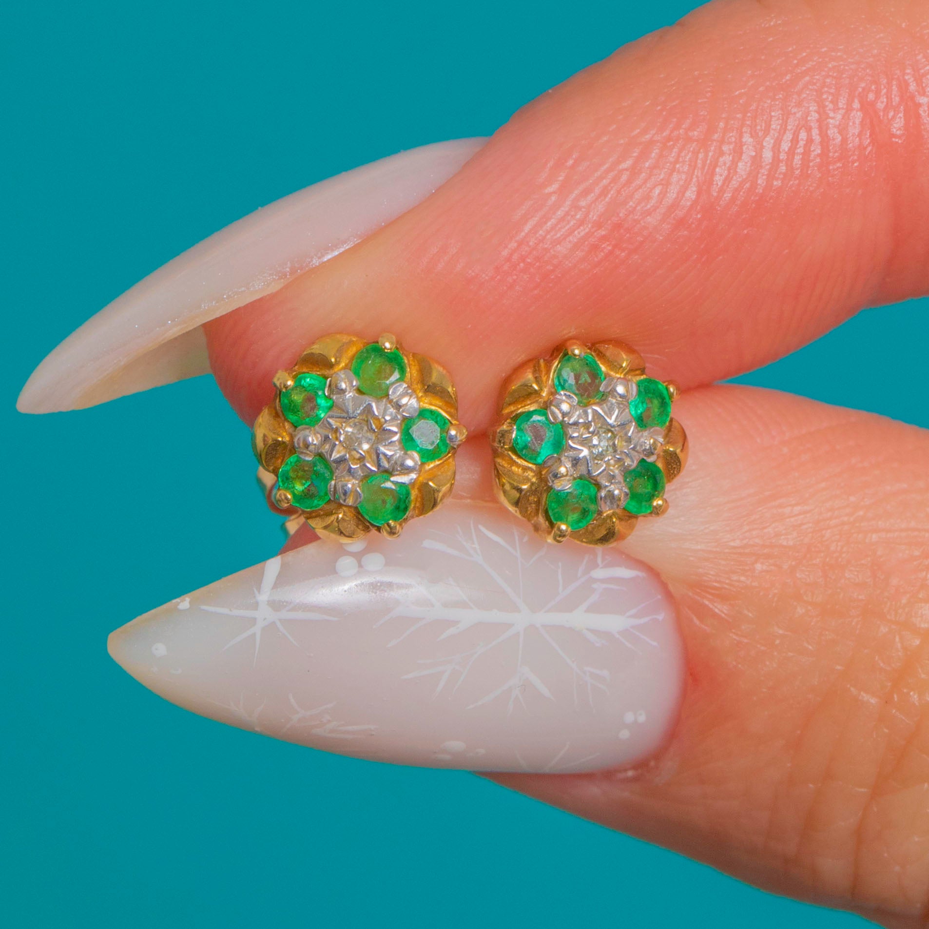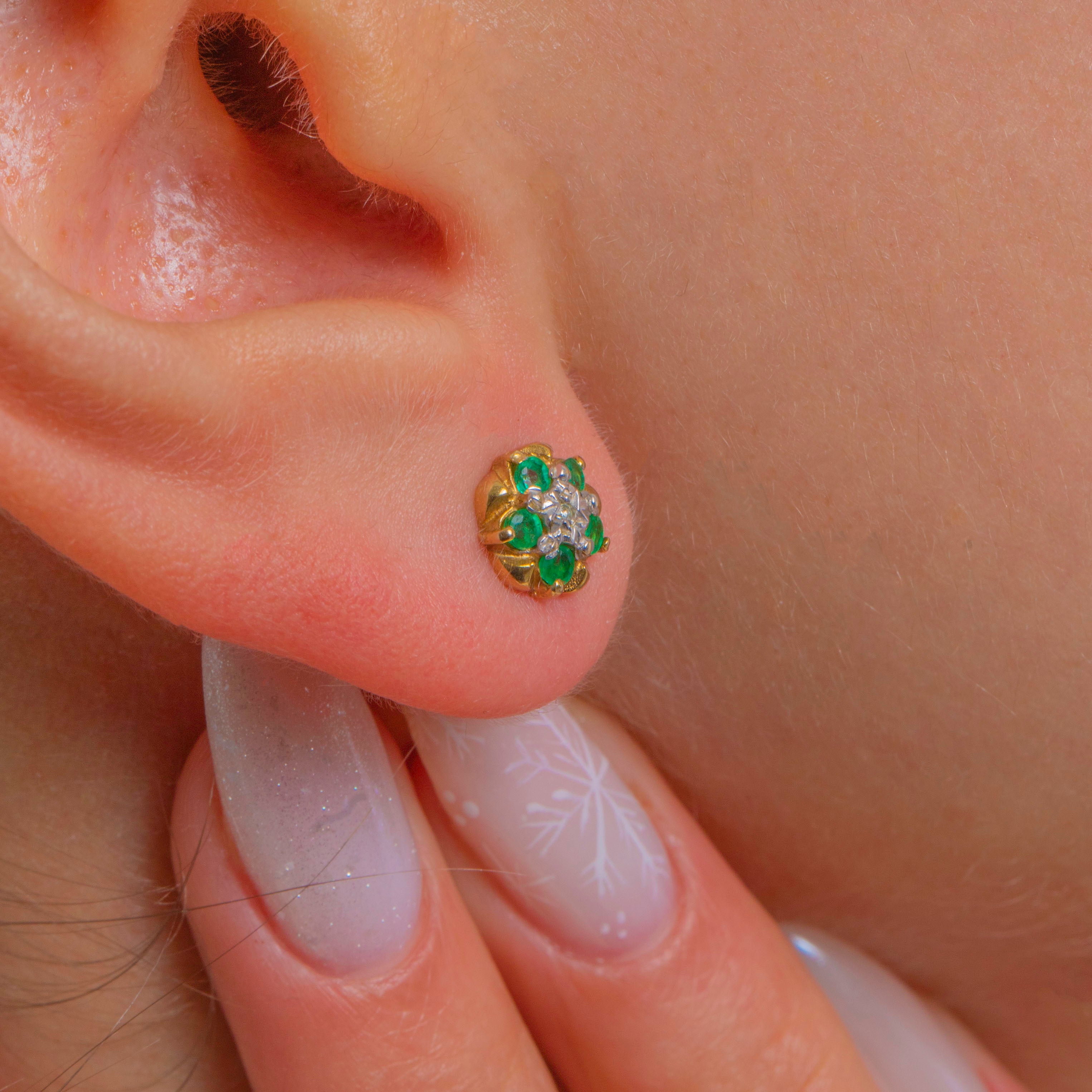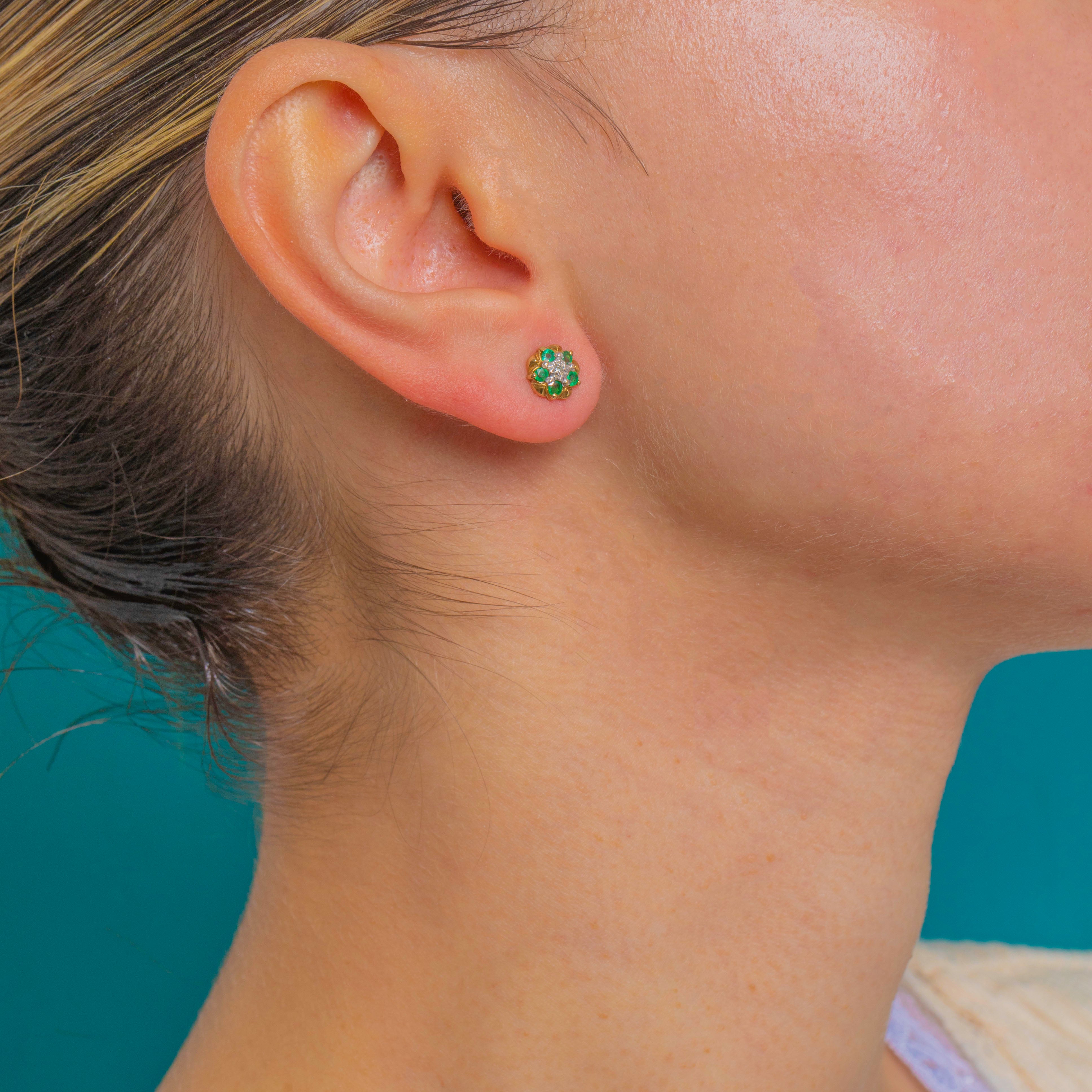 Petite and perfectly formed, these Vintage 9ct Gold buttercup cluster studs bloom with six vivid round Emeralds circling a bright white central Diamond. The scalloped petal rim and two‑tone look lend a fresh, uplifting sparkle, while the rosette silhouette feels timeless and feminine.