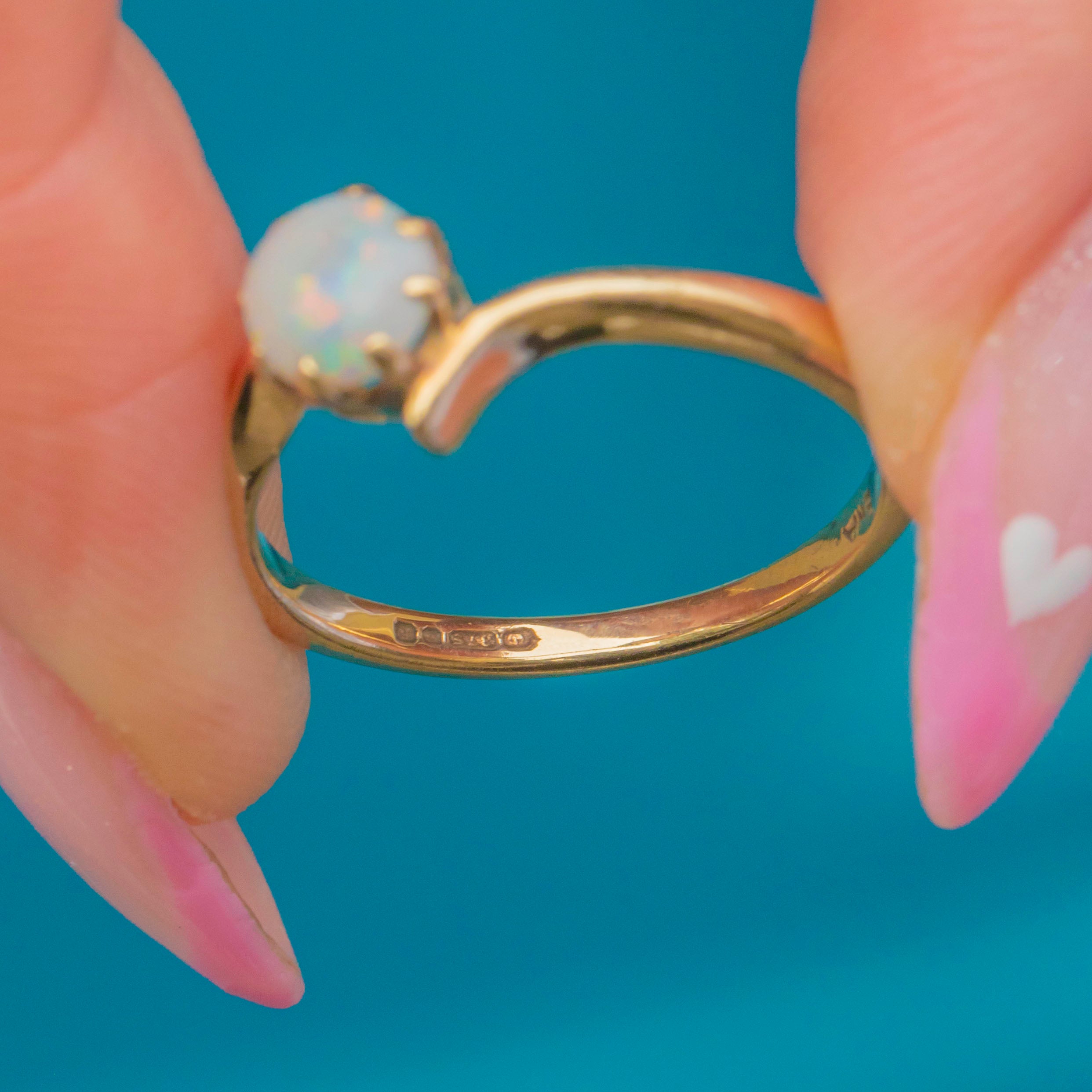 This charming Vintage Opal ring features a graceful crossover design, beautifully crafted in warm 9ct Gold. The natural solid Opal sits proudly at the centre, its milky body showing flashes of pink, green and blue as it catches the light.