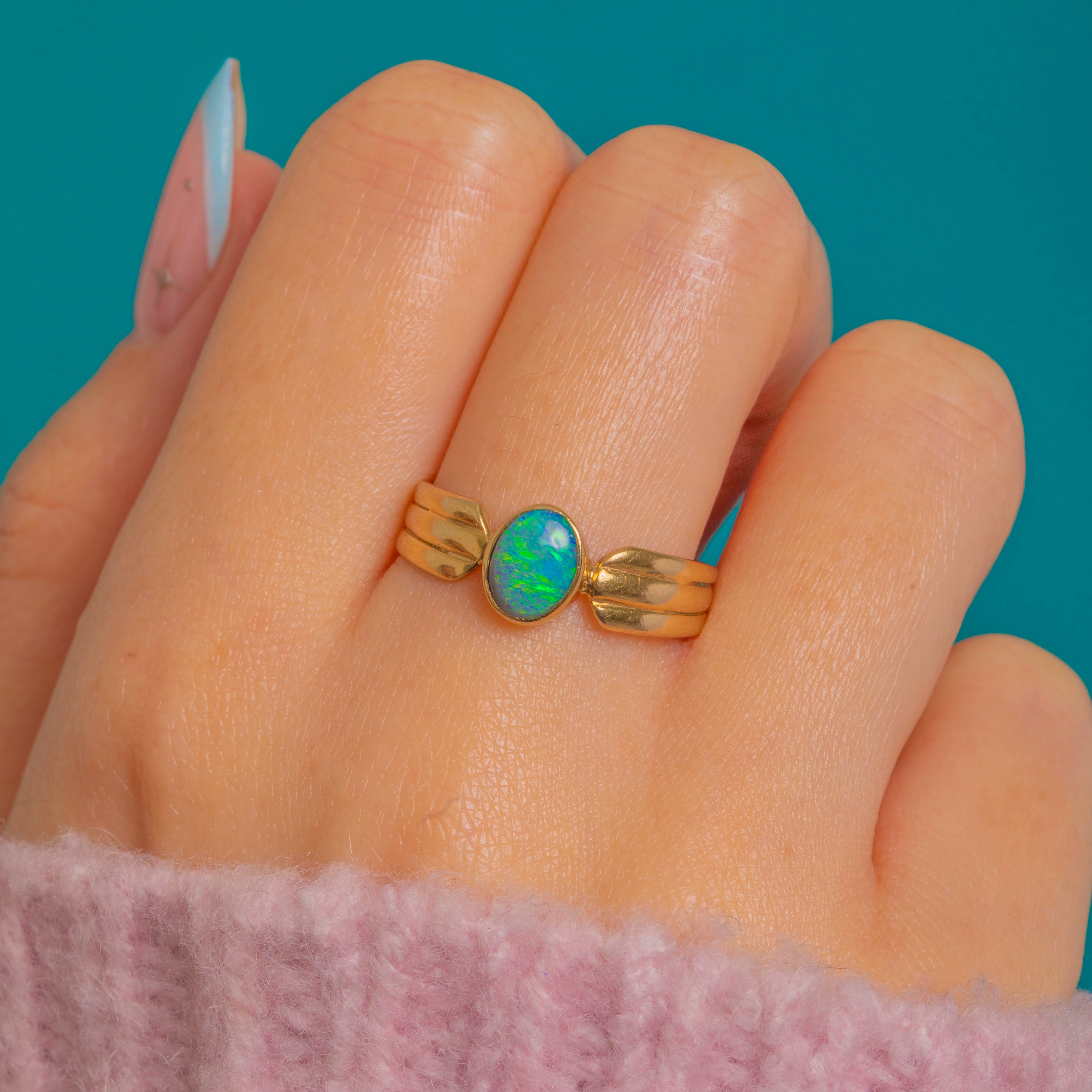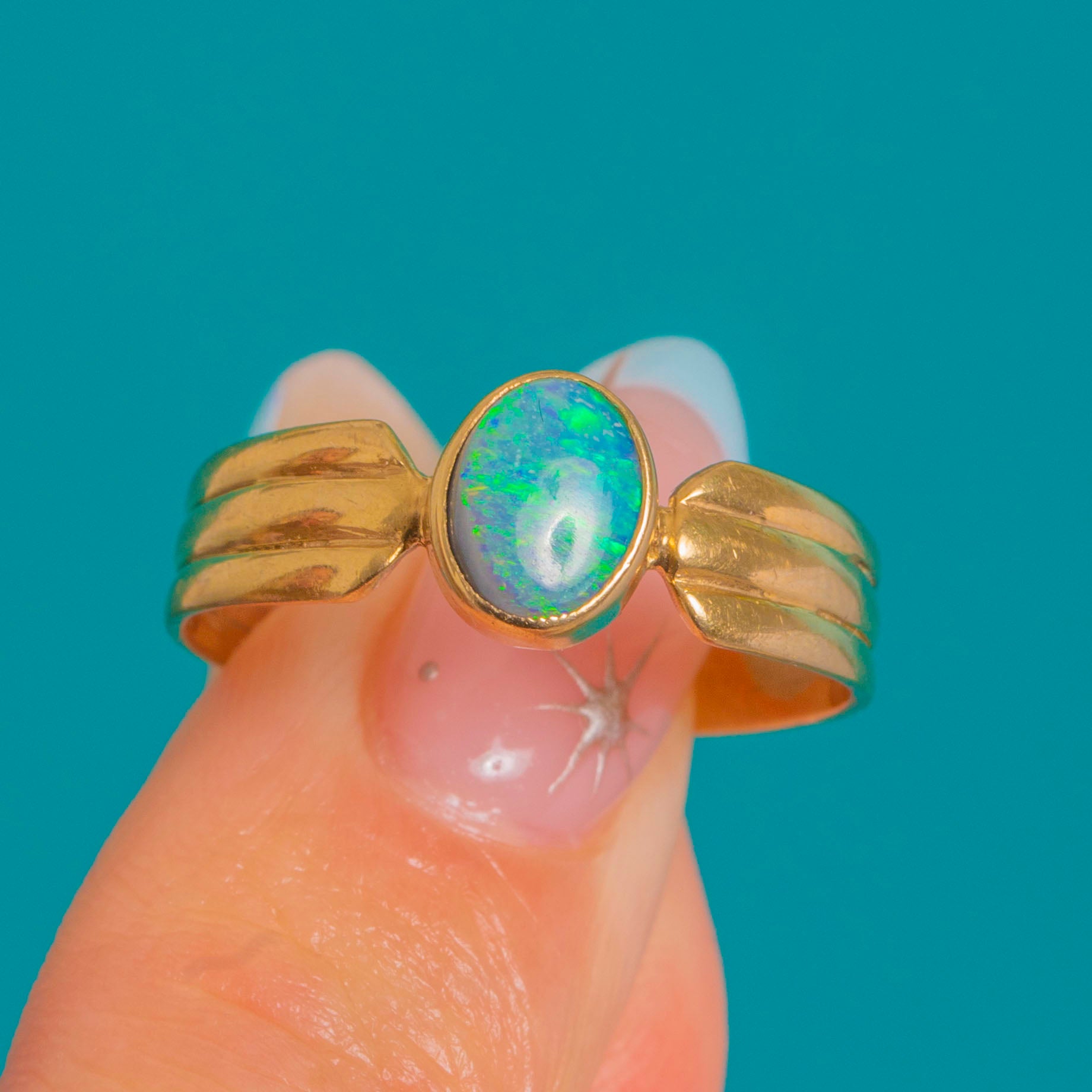 Sleek and sculptural, this Vintage Opal solitaire ring showcases a luminous oval cabochon in a smooth bezel of rich 9ct Gold. The Opal shimmers with blue‑green play‑of‑colour, its glow amplified by the ring’s low, polished setting for effortless, everyday elegance.