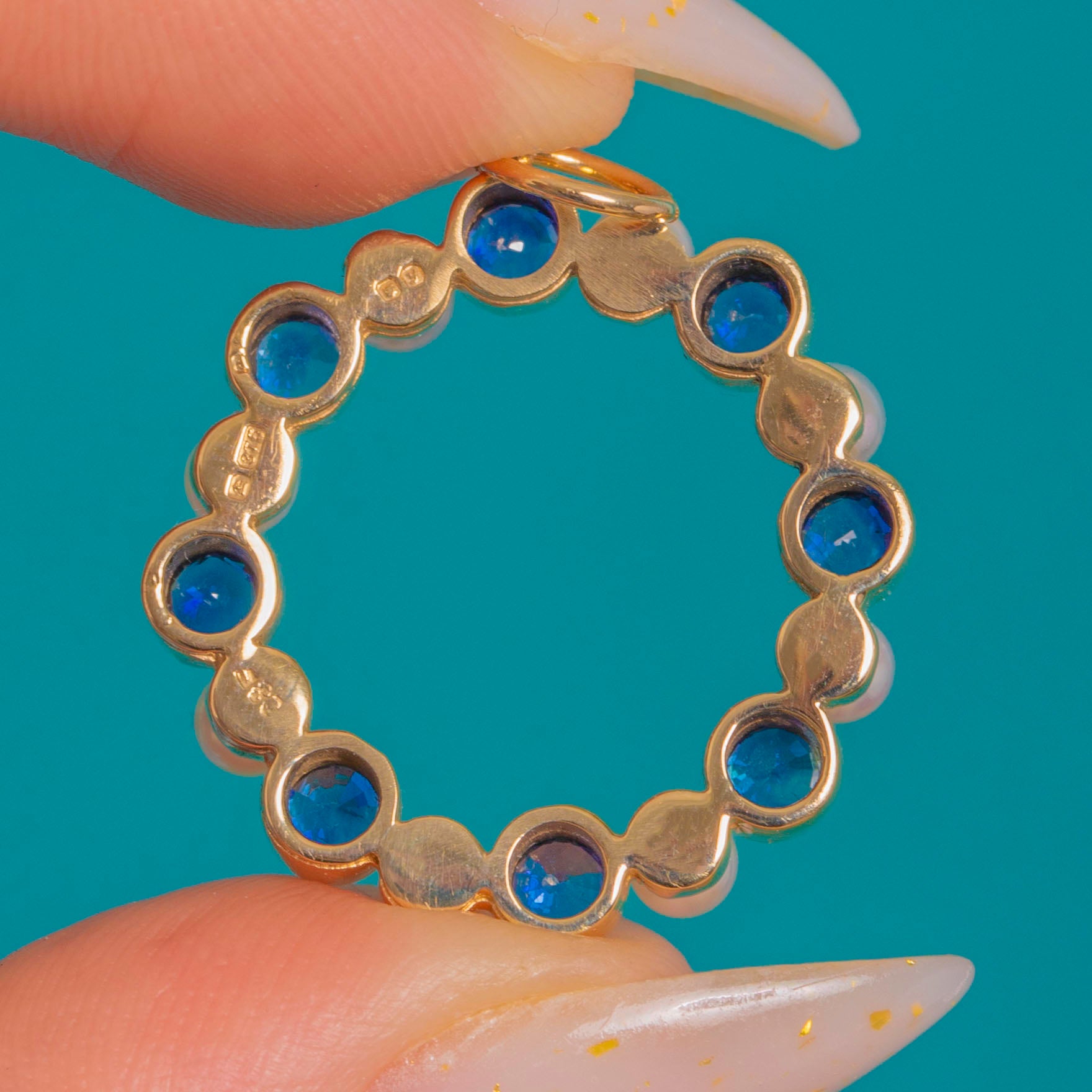 The Sapphires are open-backed to invite the light, while the Pearls sit in closed cups for a pristine, uniform finish. Fully hallmarked for London, 1998, this classic blue-and-white roundel captures the timeless charm of antique garland motifs with the crisp craftsmanship of late 20th-century design.