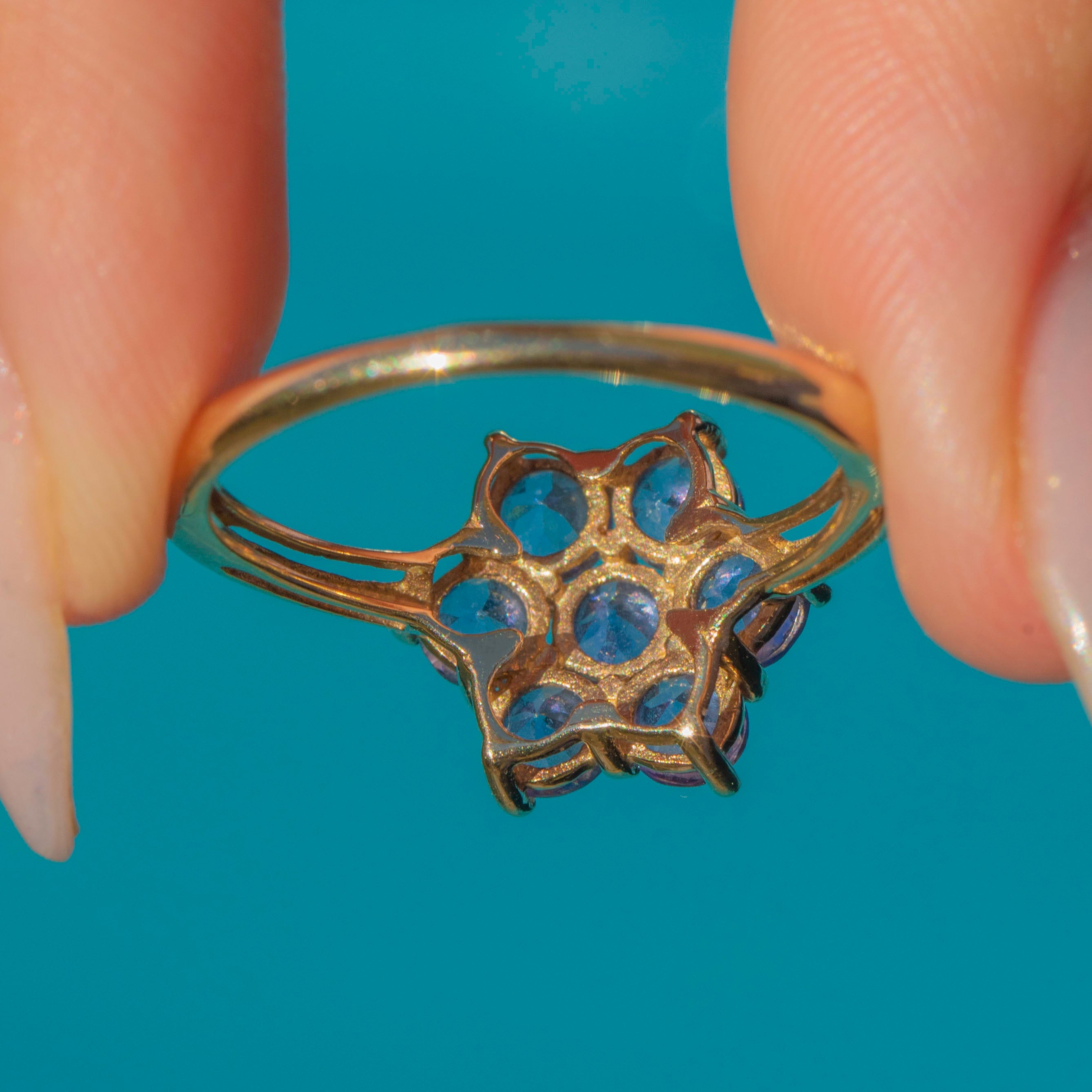This Vintage Tanzanite cluster ring is full of colour and sparkle, set with seven round brilliant-cut natural Tanzanites in a bold floral arrangement. The stones range from cornflower blue to soft lilac, catching the light beautifully against the 9ct Yellow Gold setting. With its classic cluster design and delicate symmetry, this piece makes a charming addition to any collection, perfect for both everyday wear and special occasions.