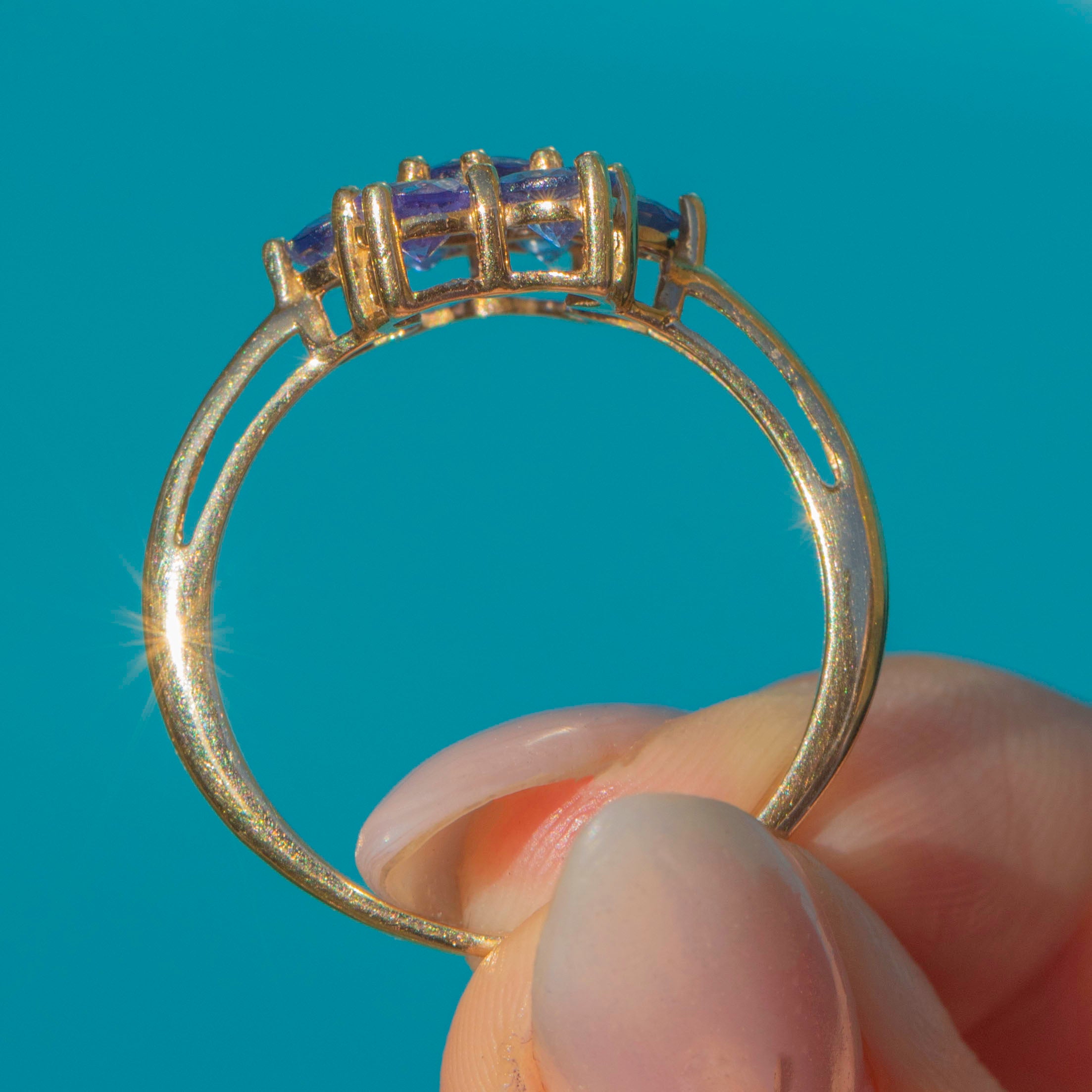 VERY GOOD – EXCELLENT: The Tanzanites are well matched in colour and securely set. The Gold remains bright and glossy, with a subtle sign of past resizing where the band is slightly thinner at the back. The shank is still strong and suitable for daily wear.