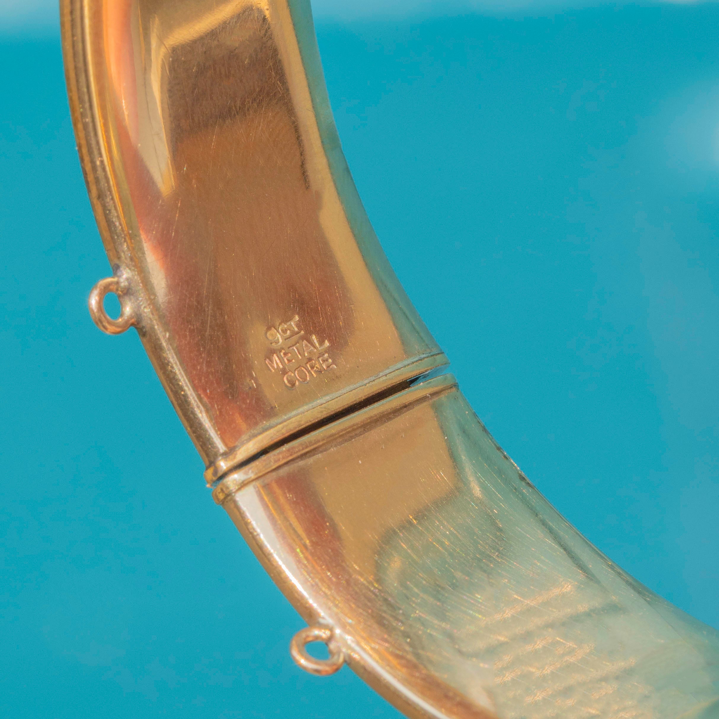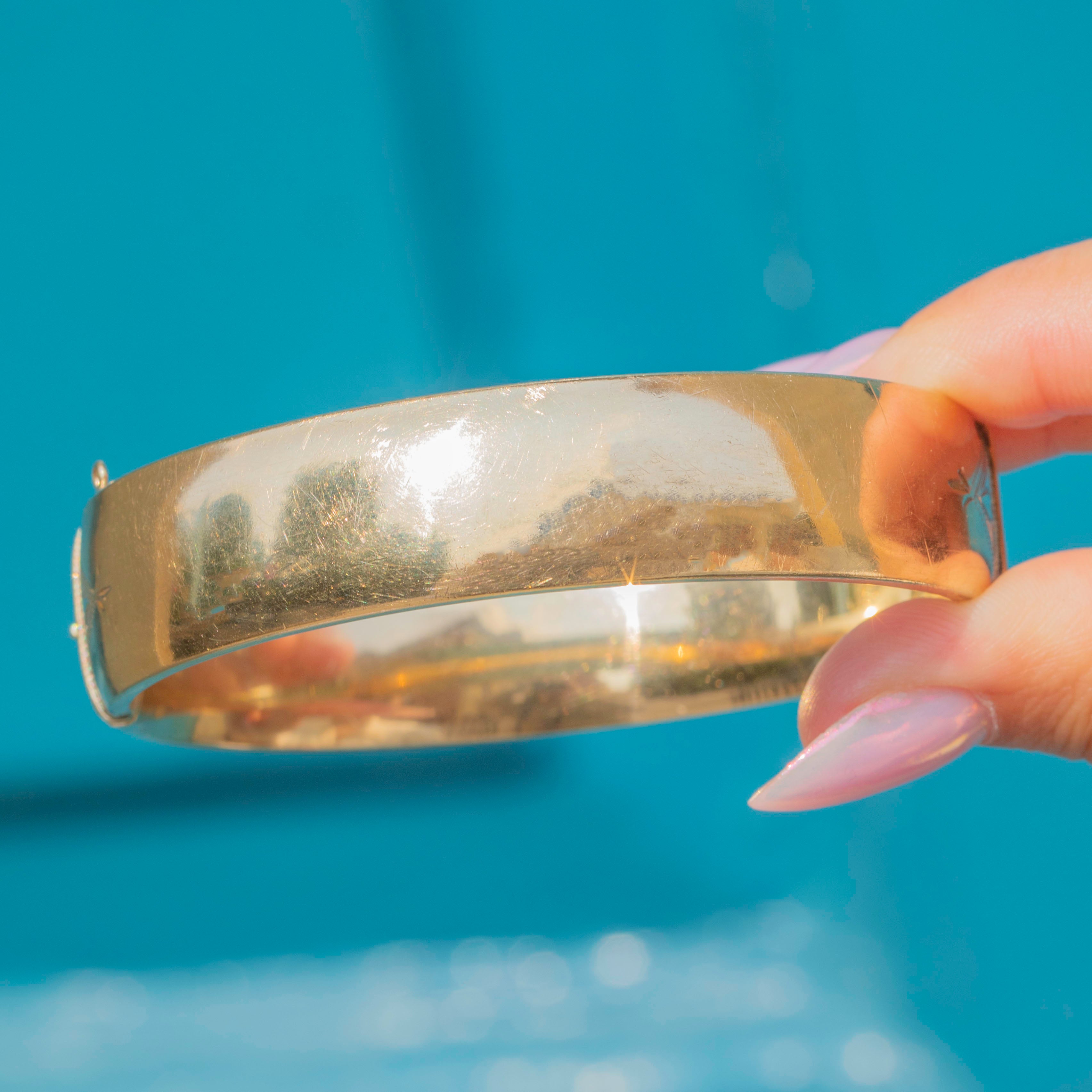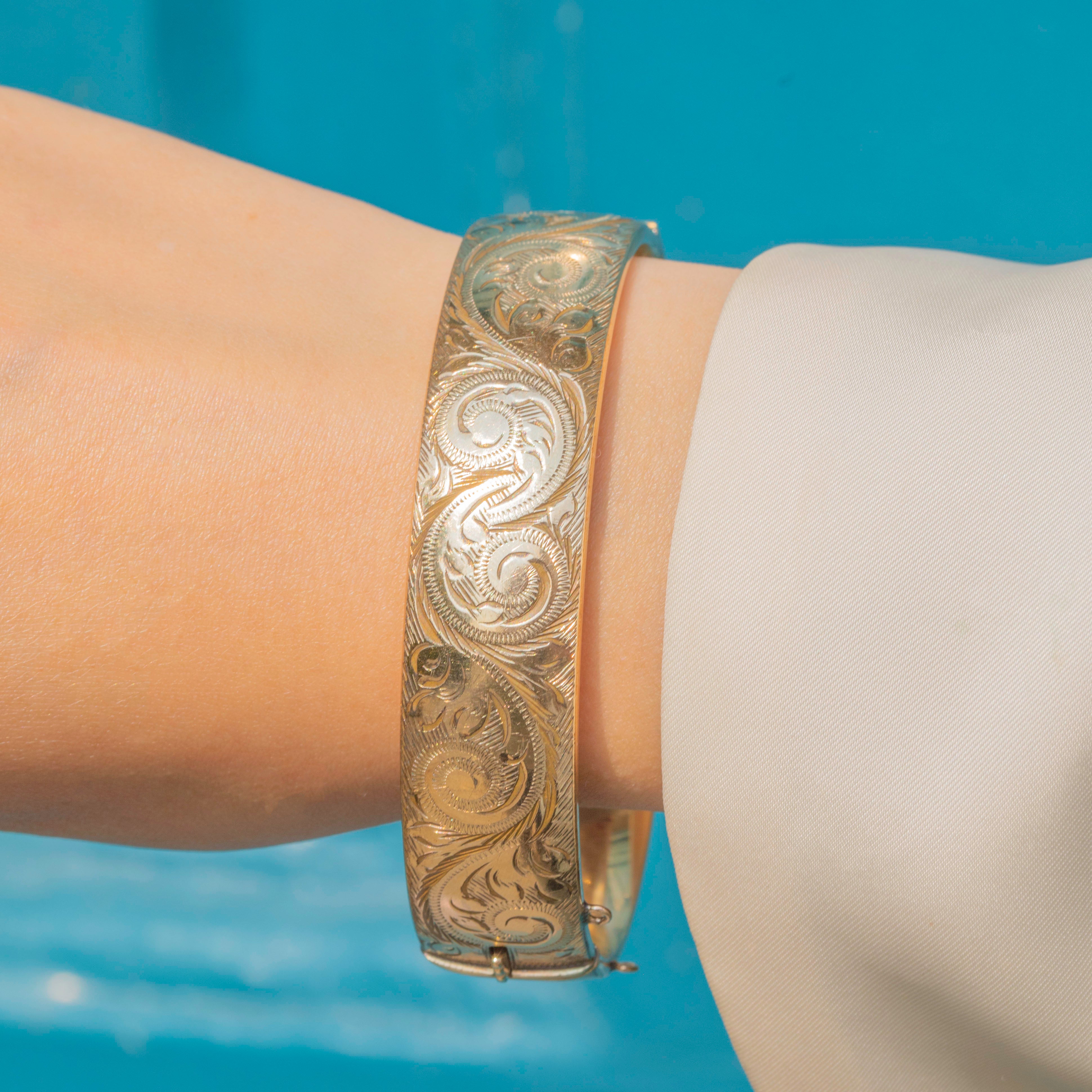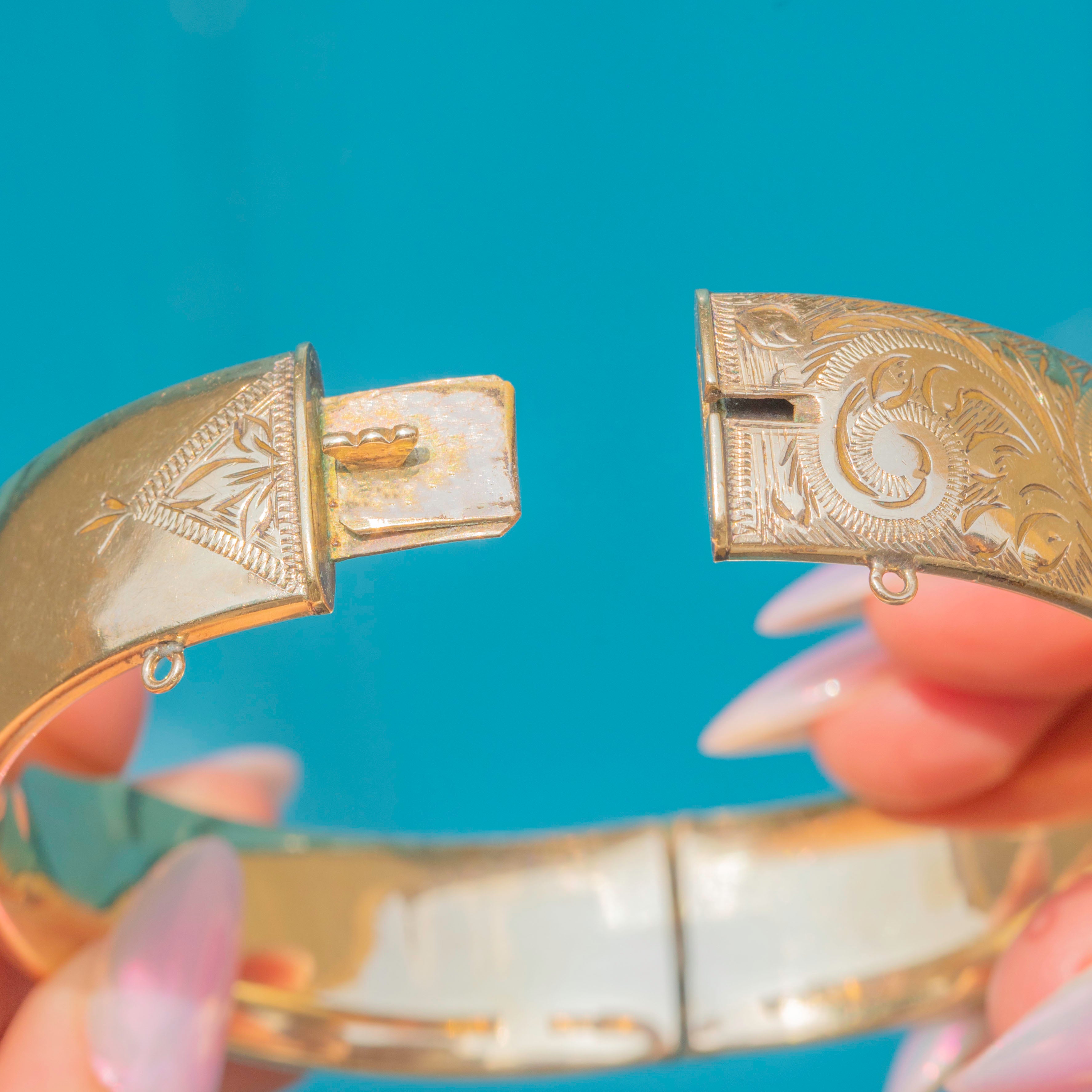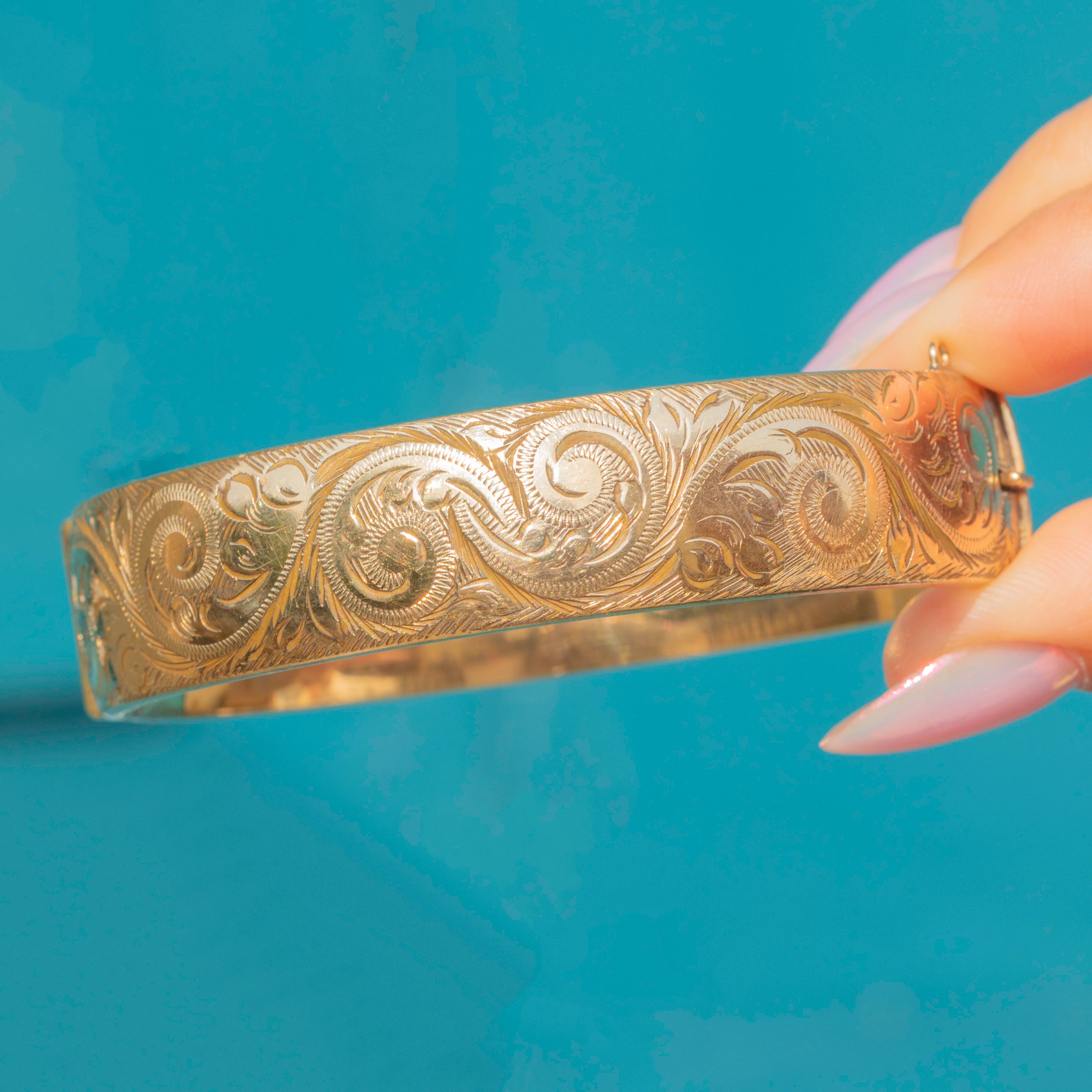 EXCELLENT: This vintage 9ct rolled Gold engraved bangle is in superb vintage condition. Her engraved details remain clear and sharp, and her clasp shuts tightly. To open the clasp simply push the left-hand side upwards and lightly pull open. There are no dings or wear to the rolled Gold, which remains bright throughout. A vintage Gold bangle with oodles of timeless charm!