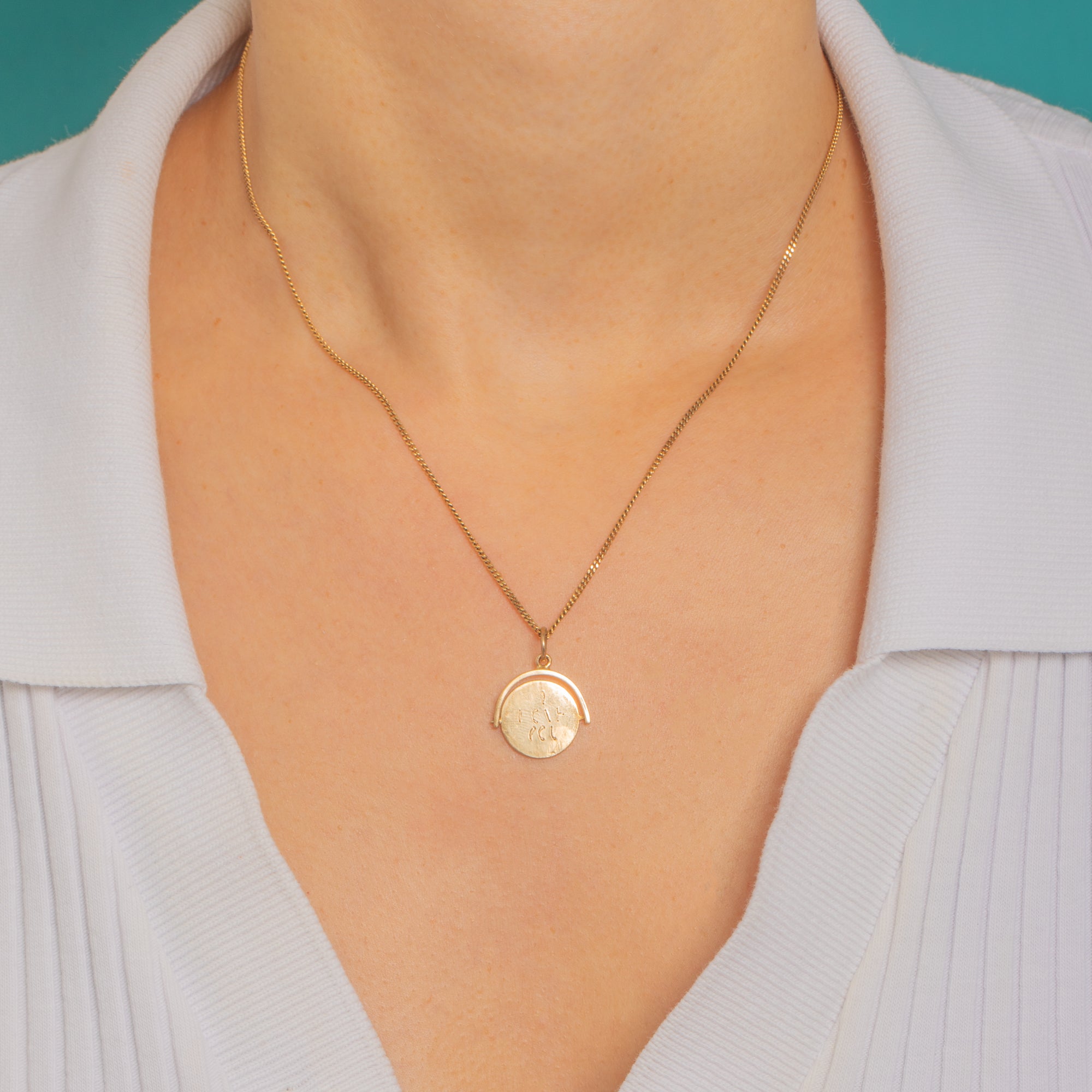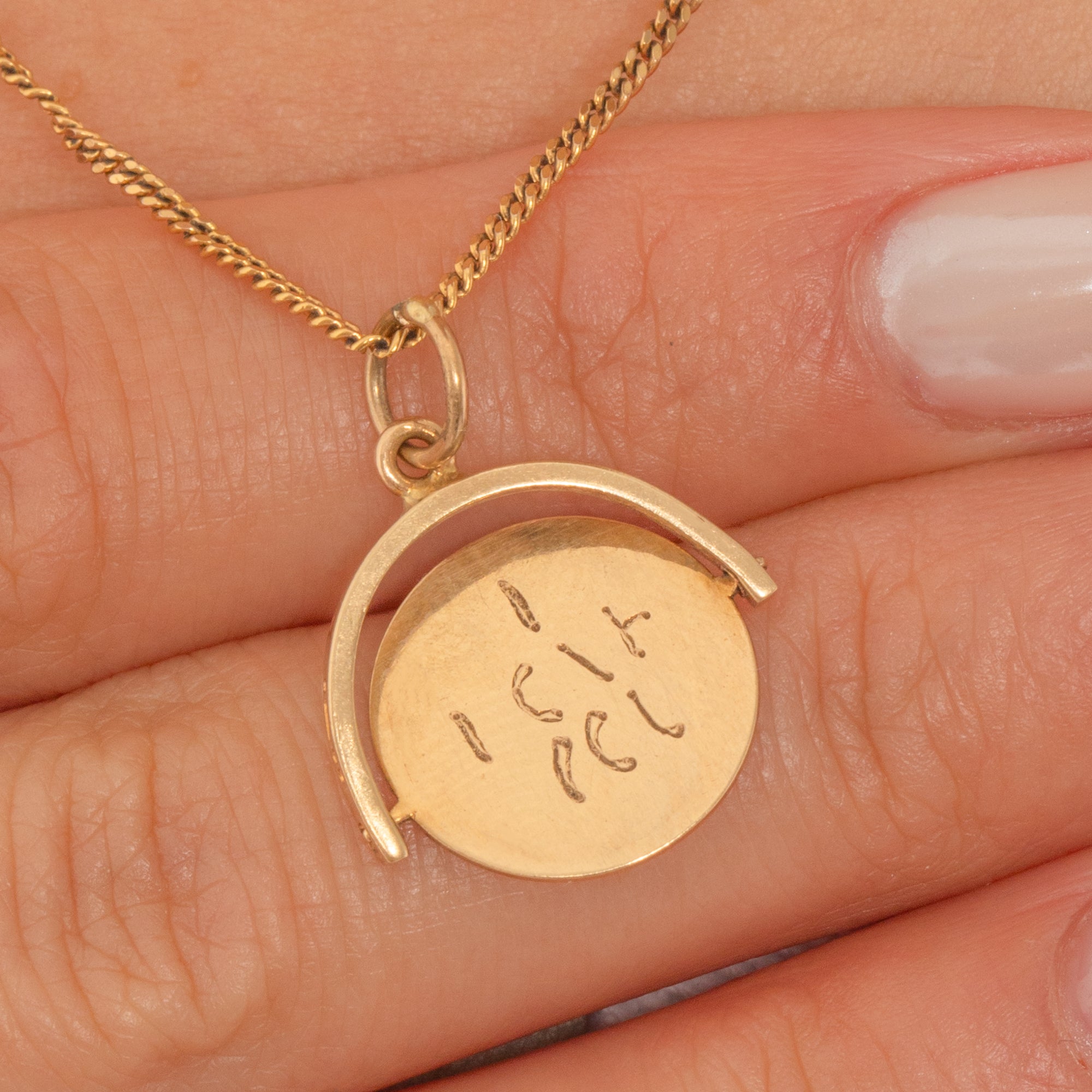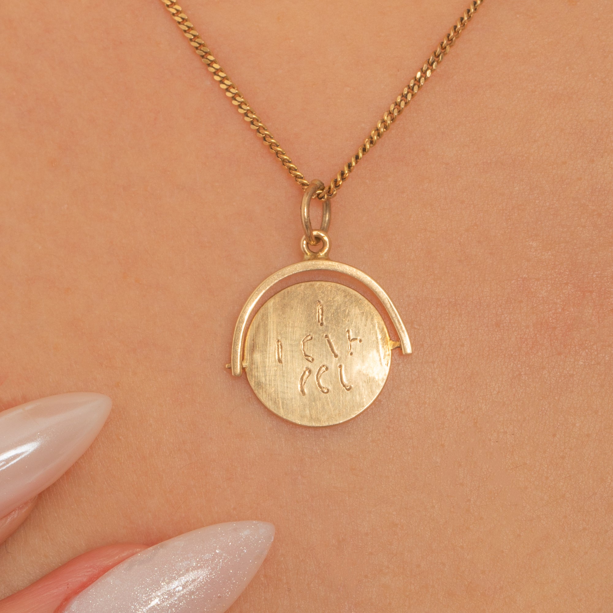 A petite Vintage 9ct Gold spinning “I Love You” charm with a sleek, minimalist silhouette. The flat circular disc rotates within a refined D‑shaped yoke, keeping the look modern and effortless. Its softly polished surfaces catch the light beautifully, making it a sweet, sentimental accent for everyday wear.