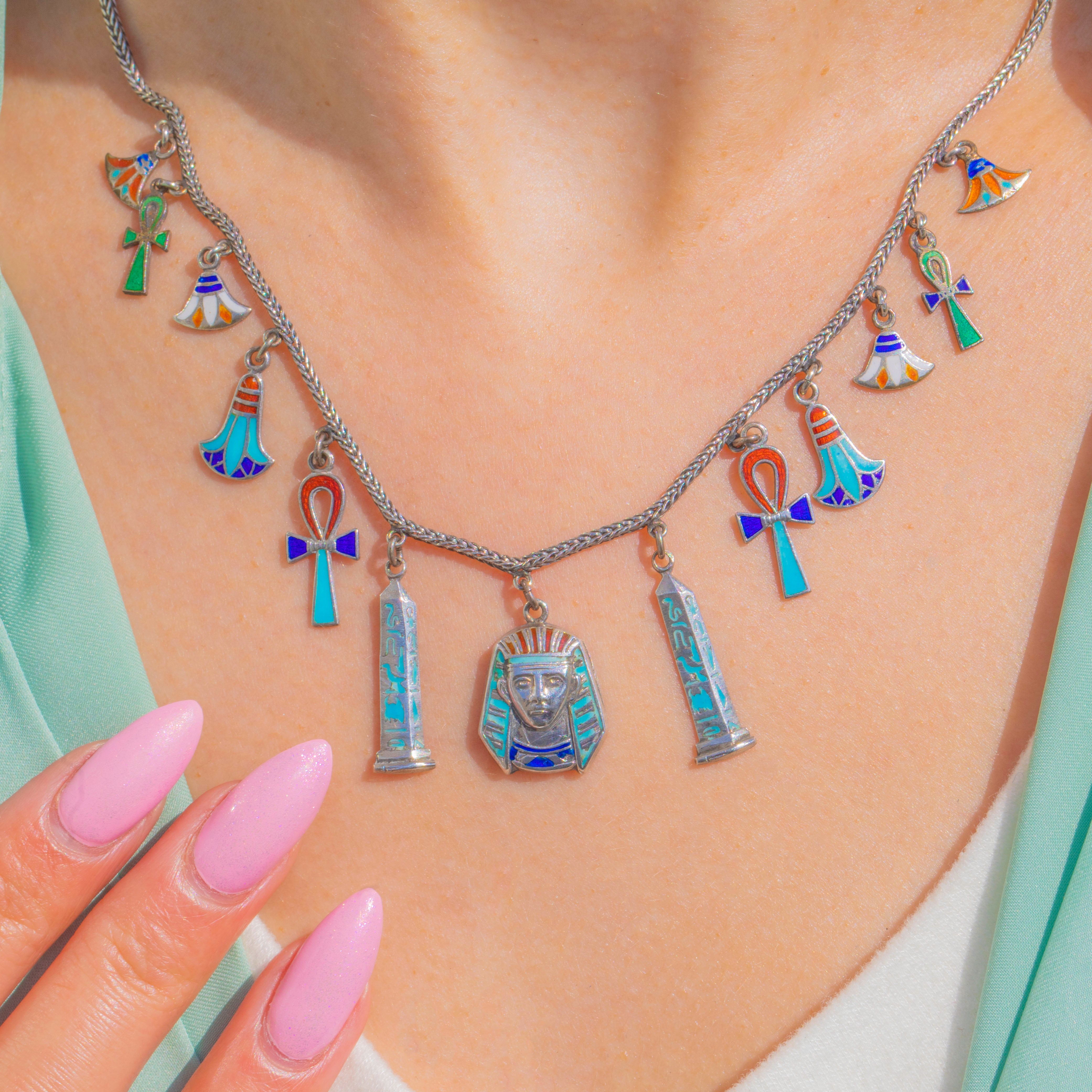 Vivid and full of movement, this Vintage Silver Egyptian Revival charm necklace brings together a rope chain with a parade of colourful Enamelled motifs. A bold Tutankhamun head sits among ankhs, cartouche and obelisk-style panels with hieroglyphic detailing, and lotus-like drops, each charm articulated on small jump rings for a playful, kinetic drape. The palette glows in turquoise, deep cobalt, green, orange-red and white, with a neat barrel clasp completing the collarbone-length silhouette.