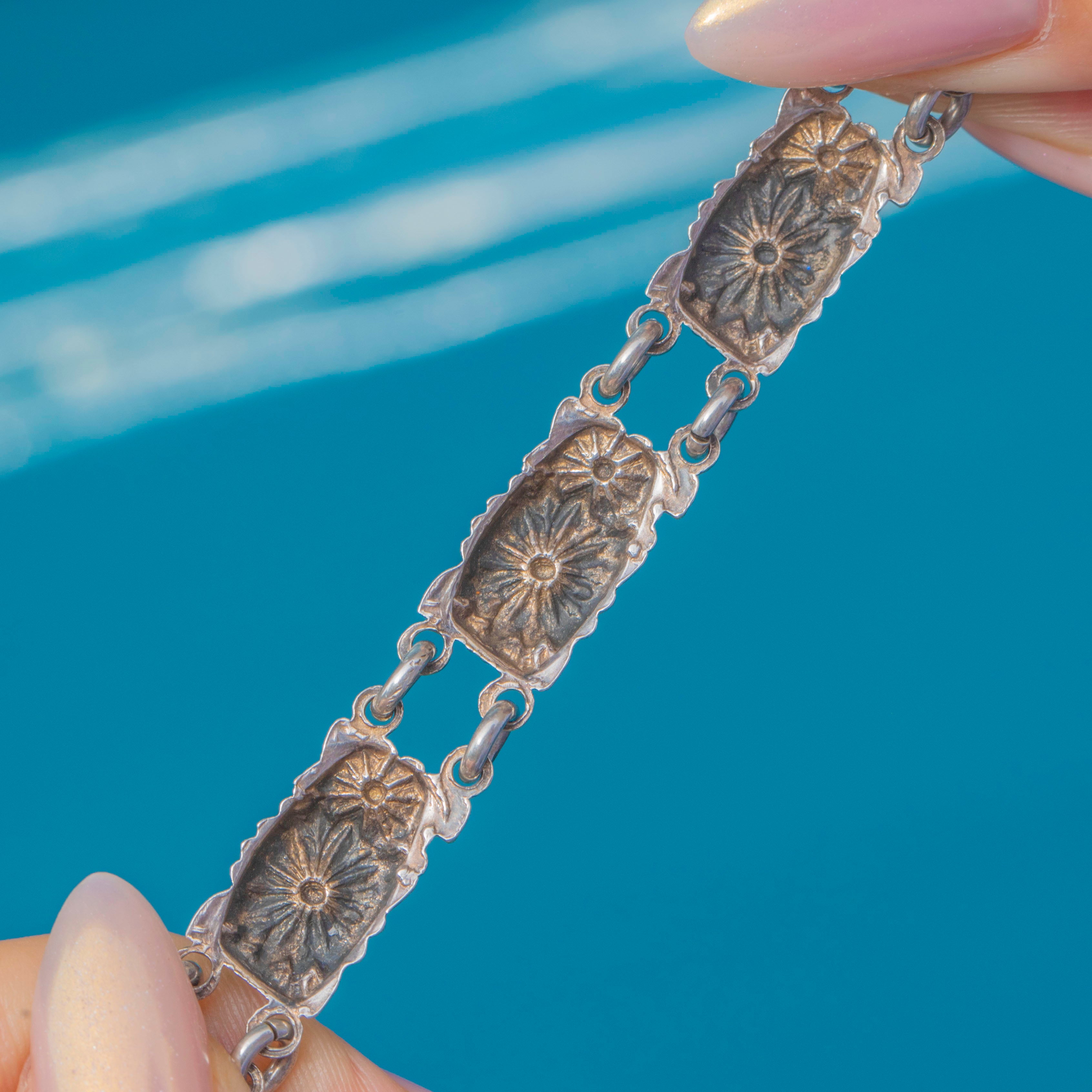 A vibrant Vintage Silver enamel bracelet, decorated with colourful floral motifs across each link. The design features orange-red and soft blue flowers, each framed in green enamel for a charming garden-like effect.