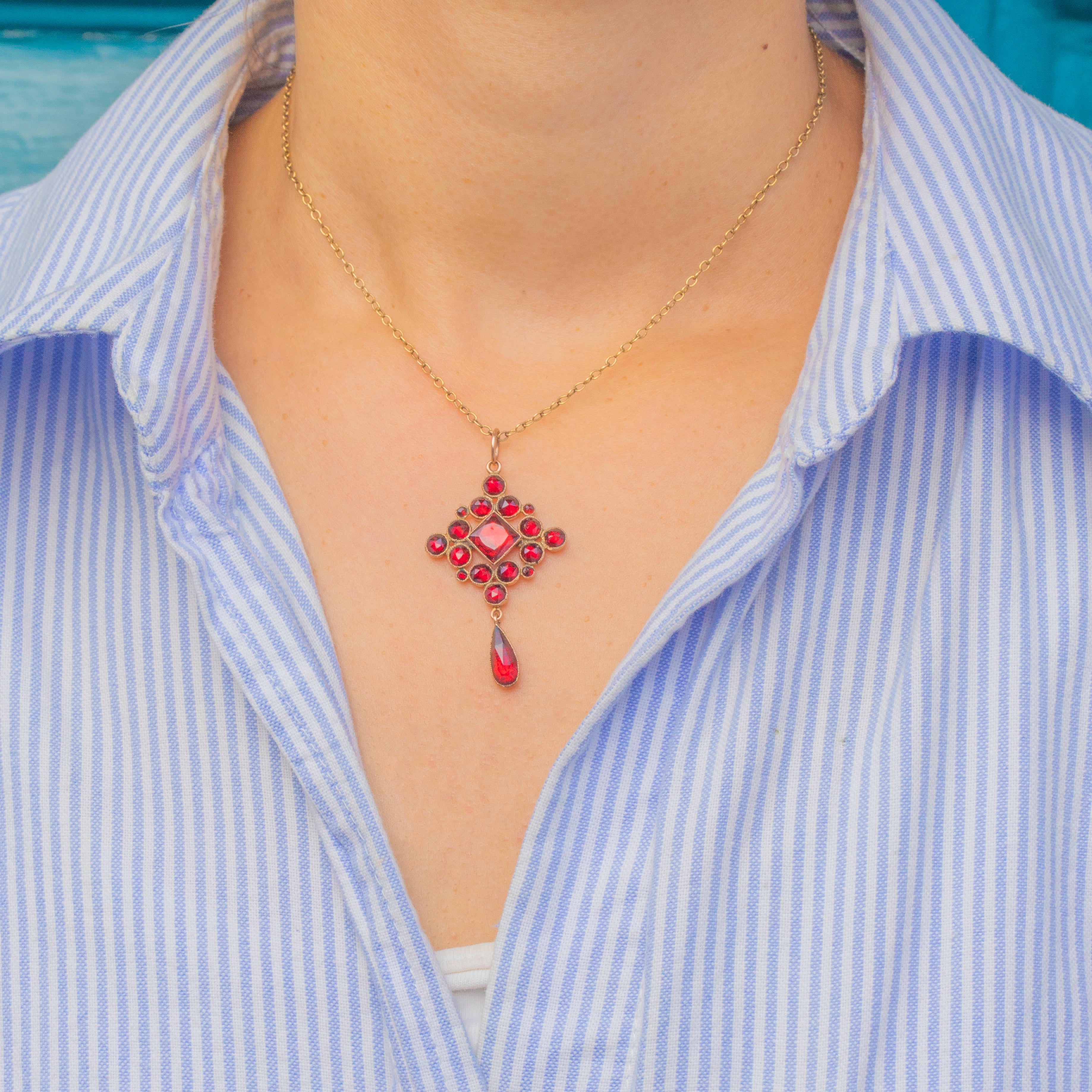 This striking Victorian pendant is set with a vibrant array of foiled-back rose-cut Garnets, their rich red tones glowing beautifully in the light. The central square-cut Garnet is surrounded by an arrangement of round Garnets and finished with a dramatic pear-shaped drop.